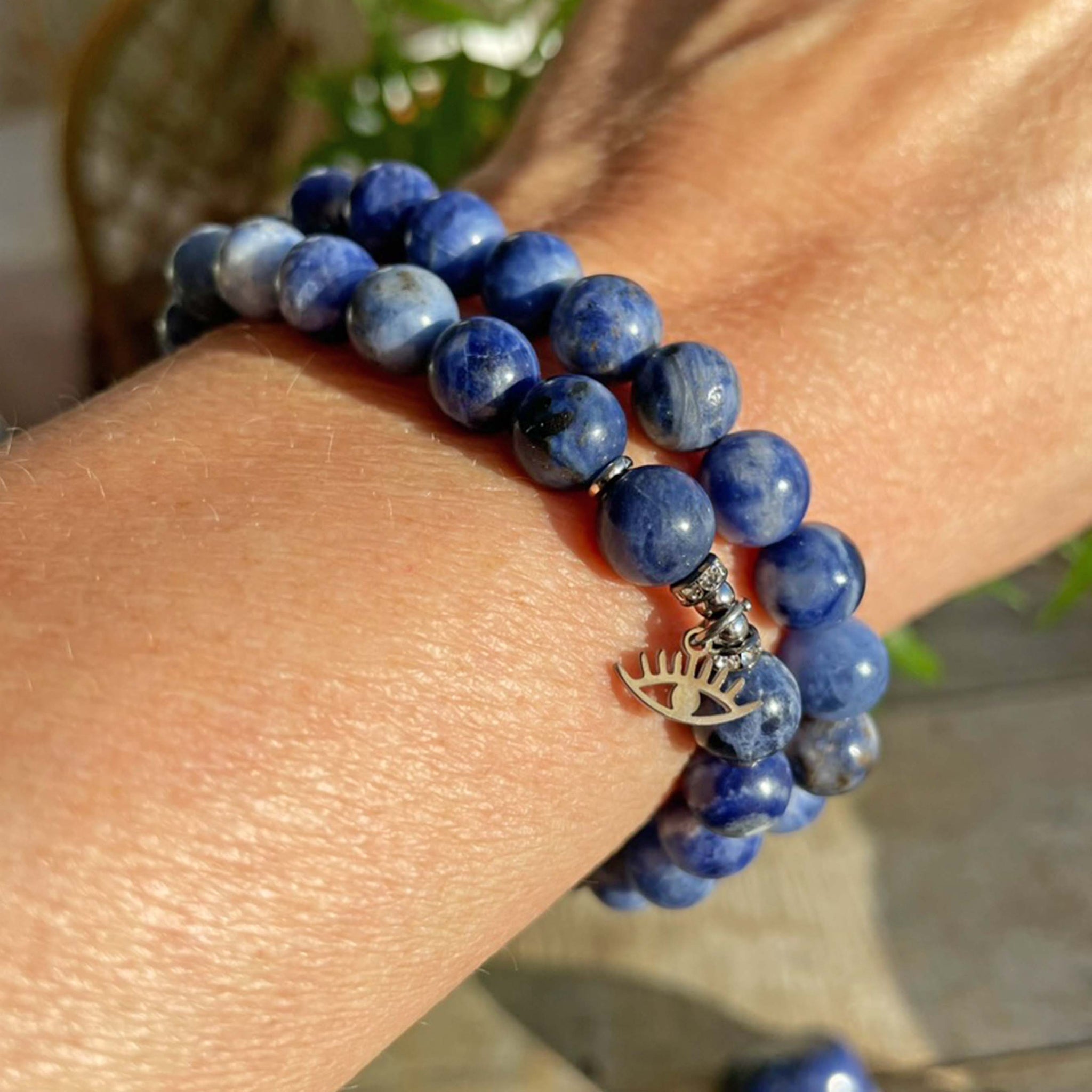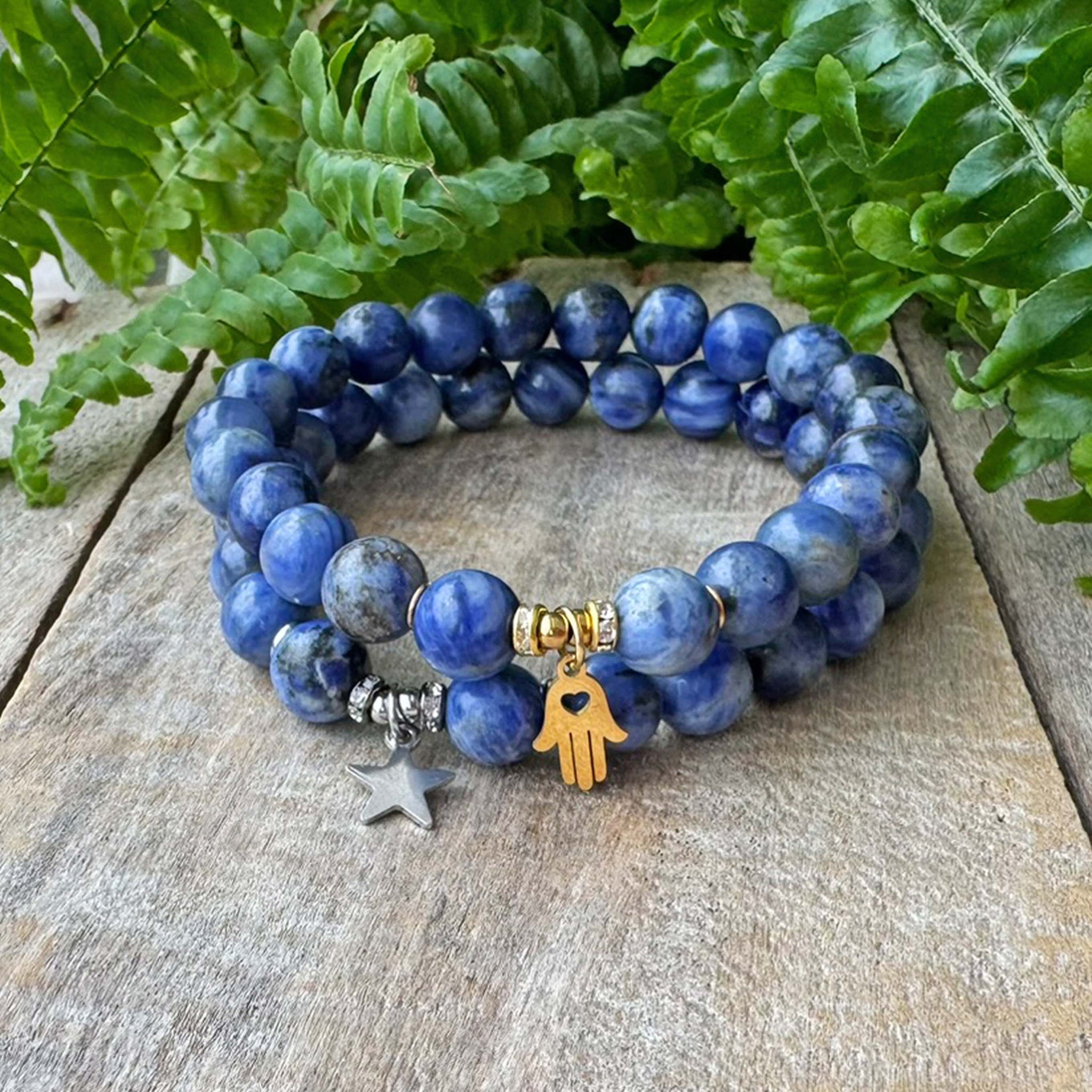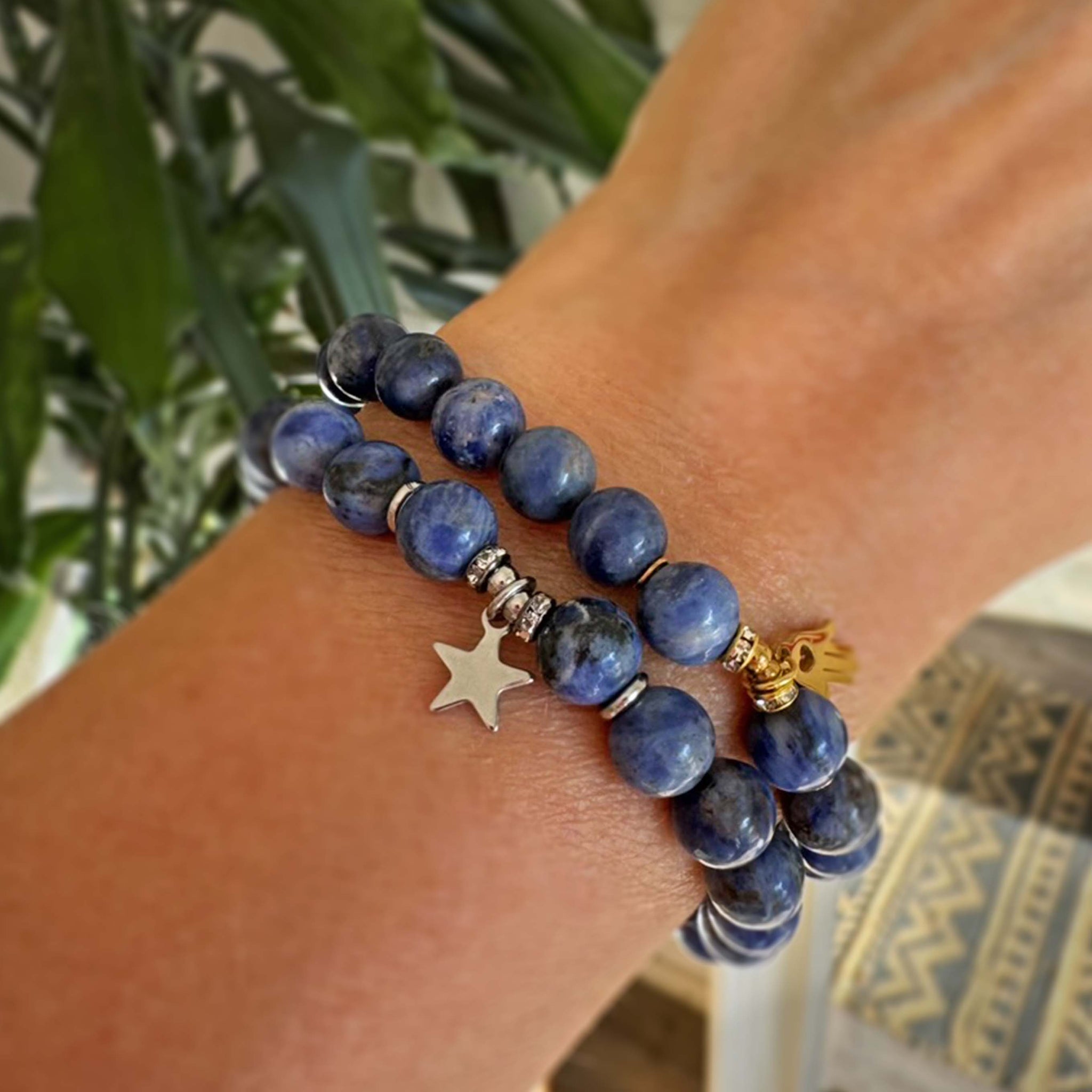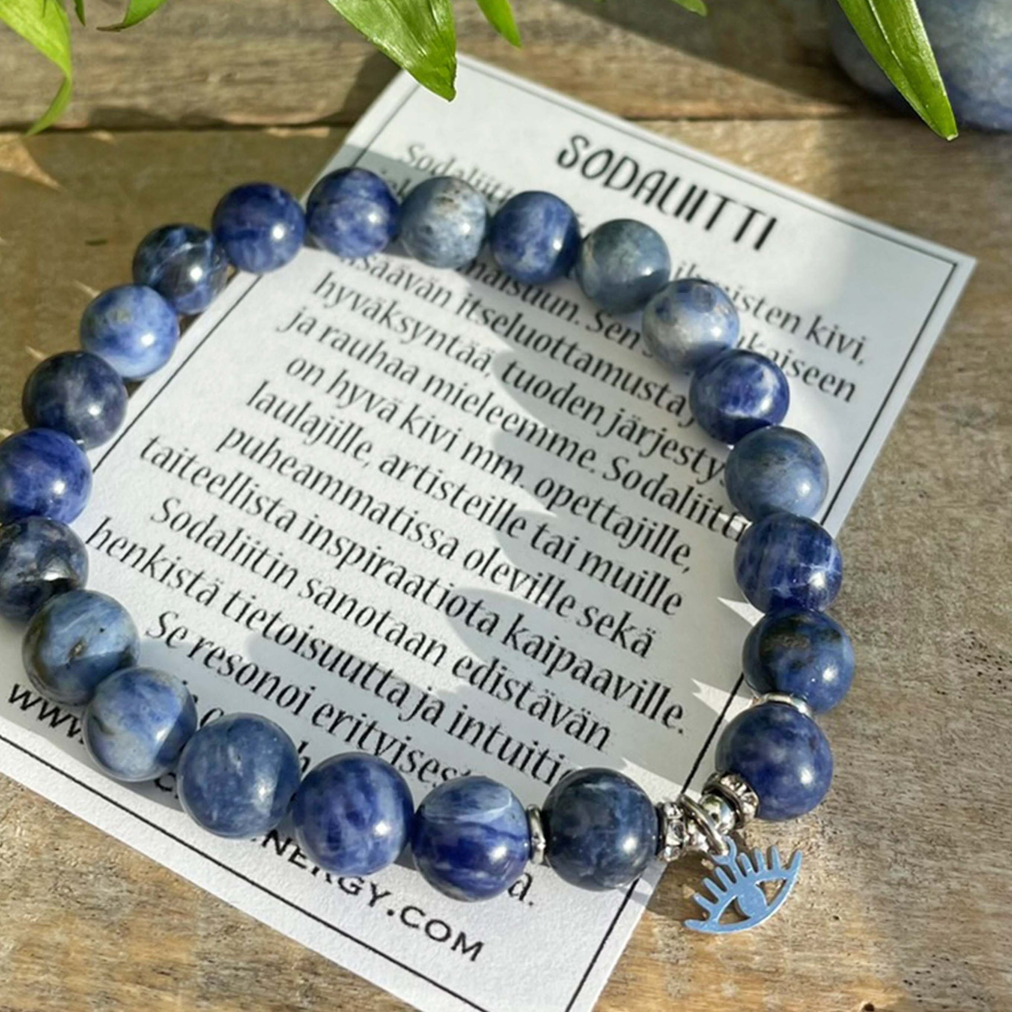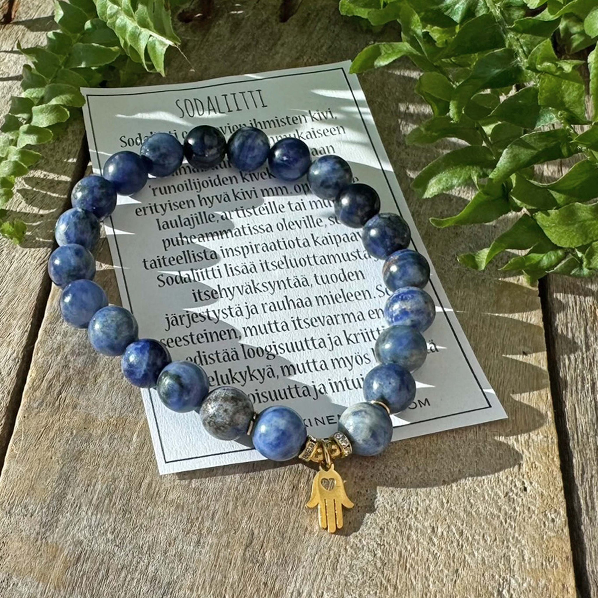 - Materiaalit: 8mm Sodaliittihelmiä, välkehtiviä rhinestone -välihelmiä, RST ruostumatonta kirurginterästä - hopea tai 18k kullattu vaihtoehto. Koru on tehty korkealaatuiseen elastiseen siimaan.