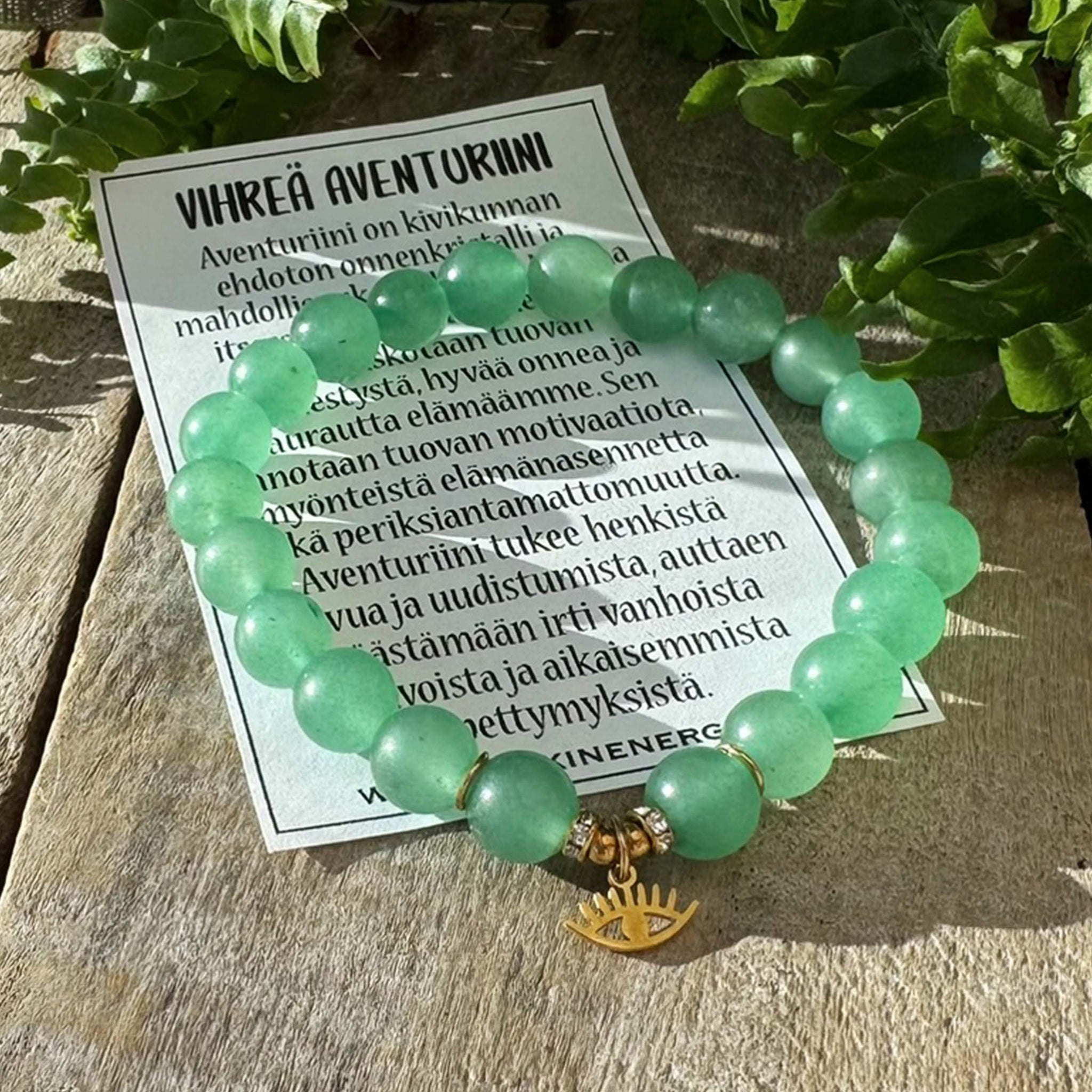 - Materiaalit: 8mm Aventuriinihelmiä, välkehtiviä rhinestone -välihelmiä, RST ruostumatonta kirurginterästä - hopea tai 18k kullattu vaihtoehto. Koru on tehty korkealaatuiseen elastiseen siimaan.
