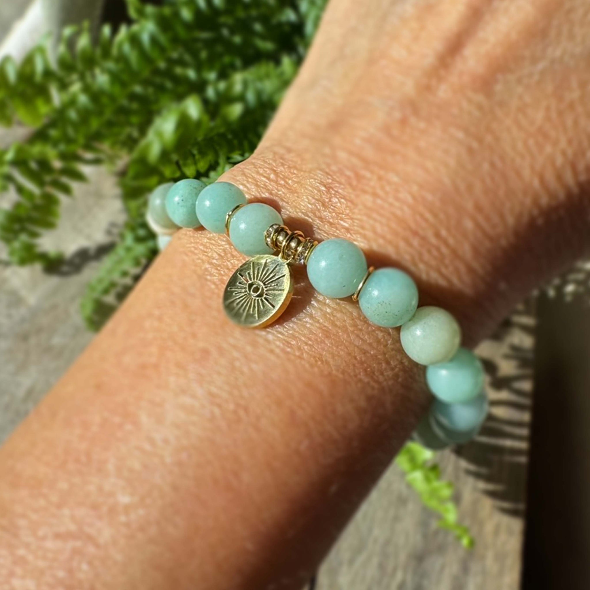 Ihana turkoosinsininen Amatsoniitti rannekoru laadukkaalla kirurginteräs (hopea/18k kullattu) charmilla.