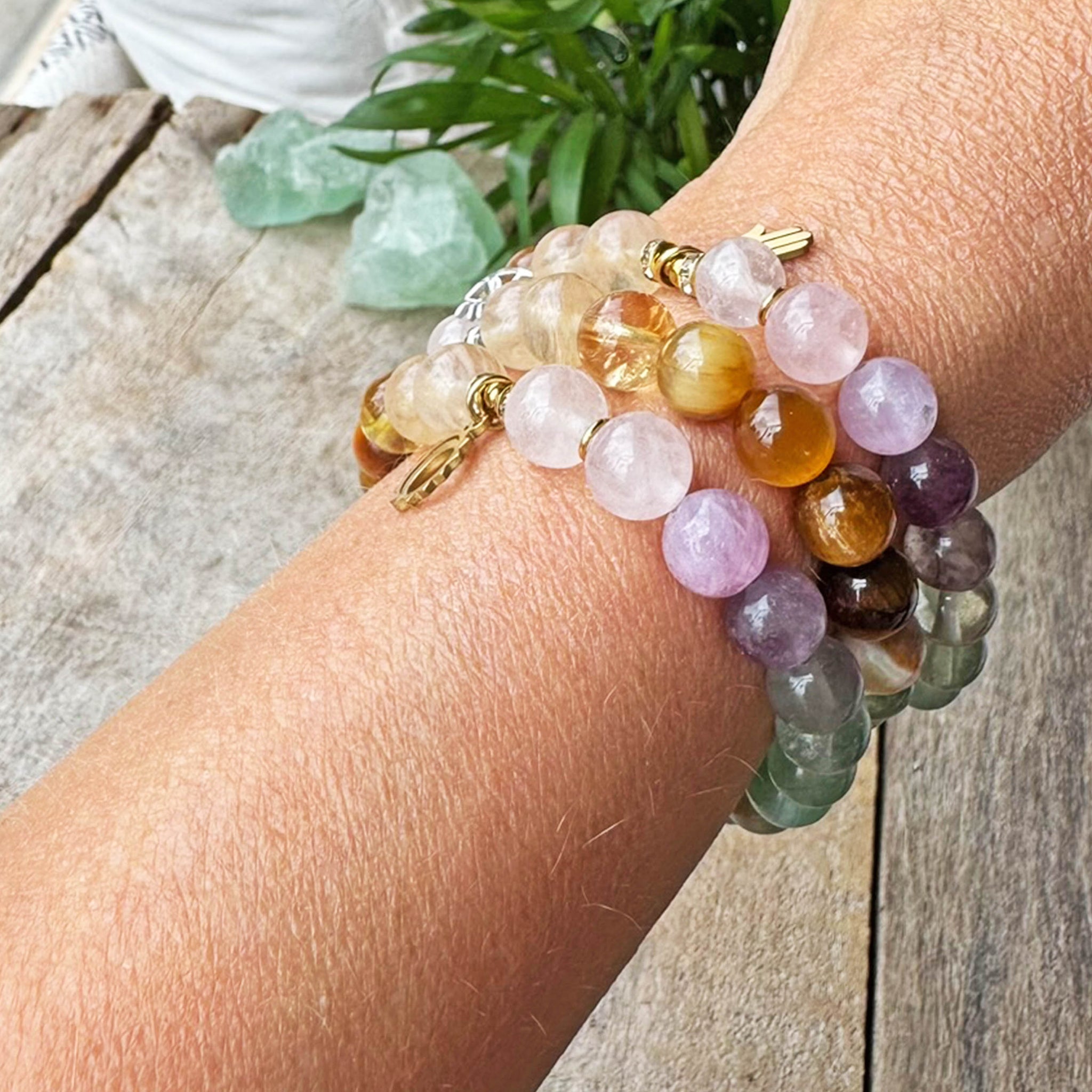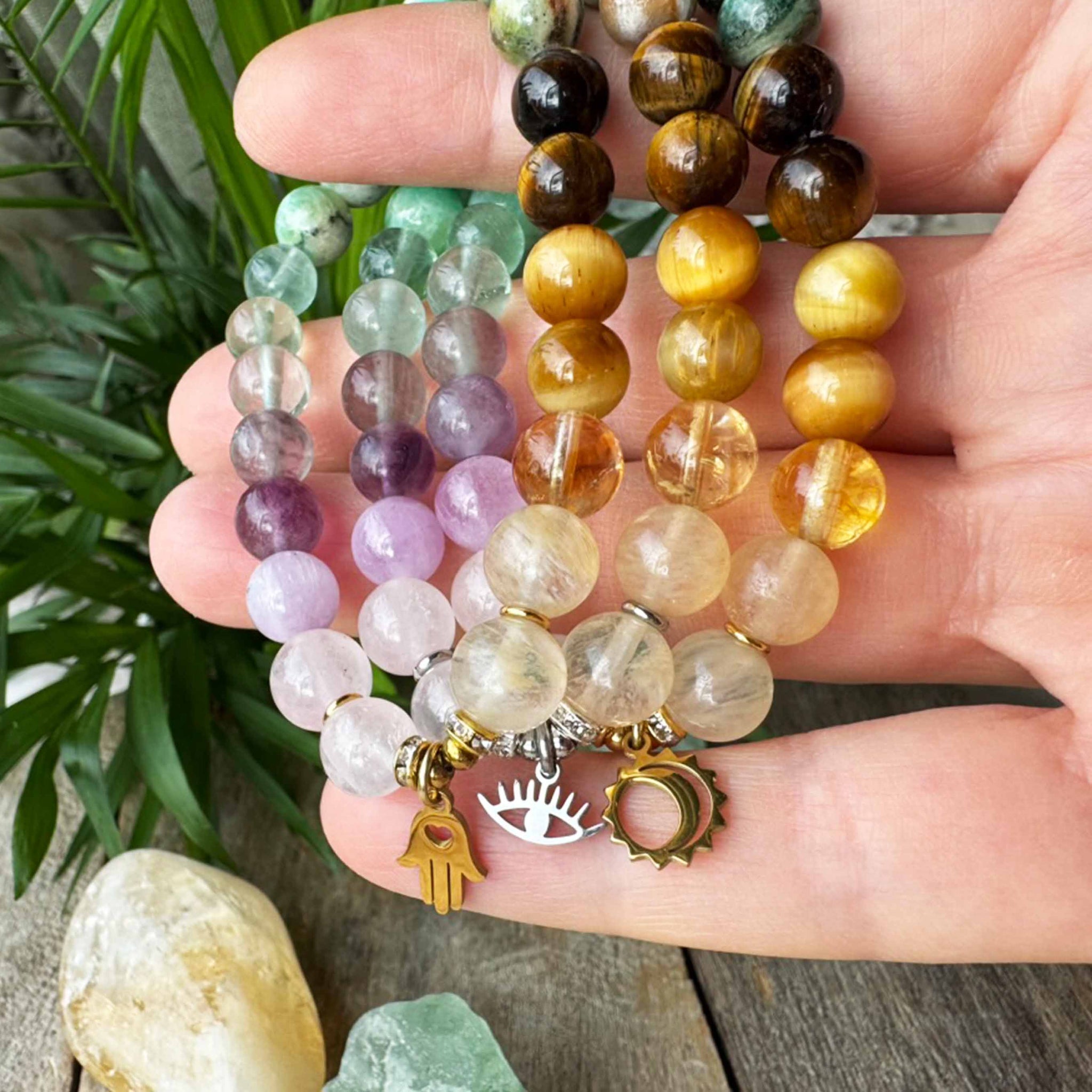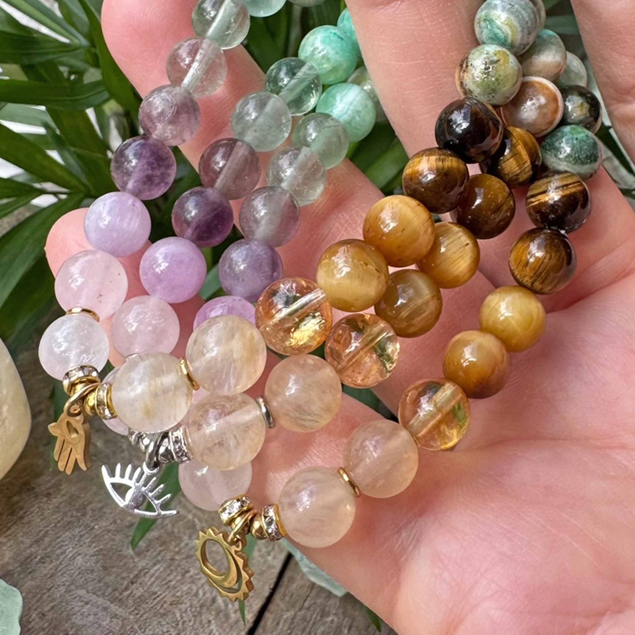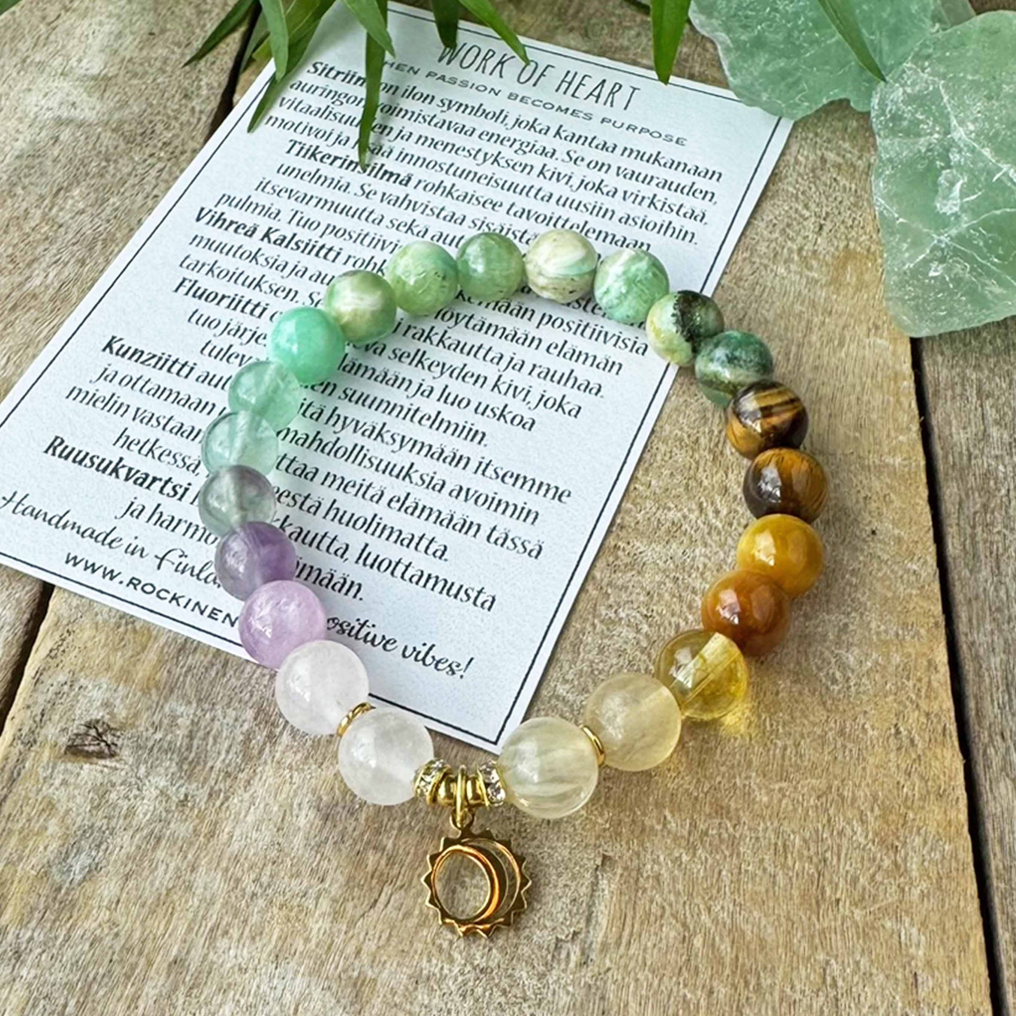 Sitriini on ilon symboli, joka kantaa mukanaan auringon voimistavaa energiaa. Se on vaurauden, vitaalisuuden ja menestyksen kivi, joka virkistää, motivoi ja lisää innostuneisuutta uusiin asioihin. Tiikerinsilmä rohkaisee tavoittelemaan unelmia. Se vahvistaa sisäistä voimaa ja itsevarmuutta sekä auttaa ratkaisemaan pulmia. Tuo positiivista näkemystä haasteisiin. Vihreä Kalsiitti rohkaisee tekemään positiivisia muutoksia ja auttaa meitä löytämään elämän tarkoituksen. Se resonoi rakkautta ja rauhaa.  Fluoriitti on suojeleva selkeyden kivi, joka tuo järjestystä elämään ja luo uskoa  tulevaisuuden suunnitelmiin. Kunziitti auttaa meitä hyväksymään itsemme ja ottamaan uusia mahdollisuuksia avoimin mielin vastaan. Se opettaa meitä elämään tässä hetkessä, menneestä huolimatta. Ruusukvartsi lisää rakkautta, luottamusta ja harmoniaa elämään.