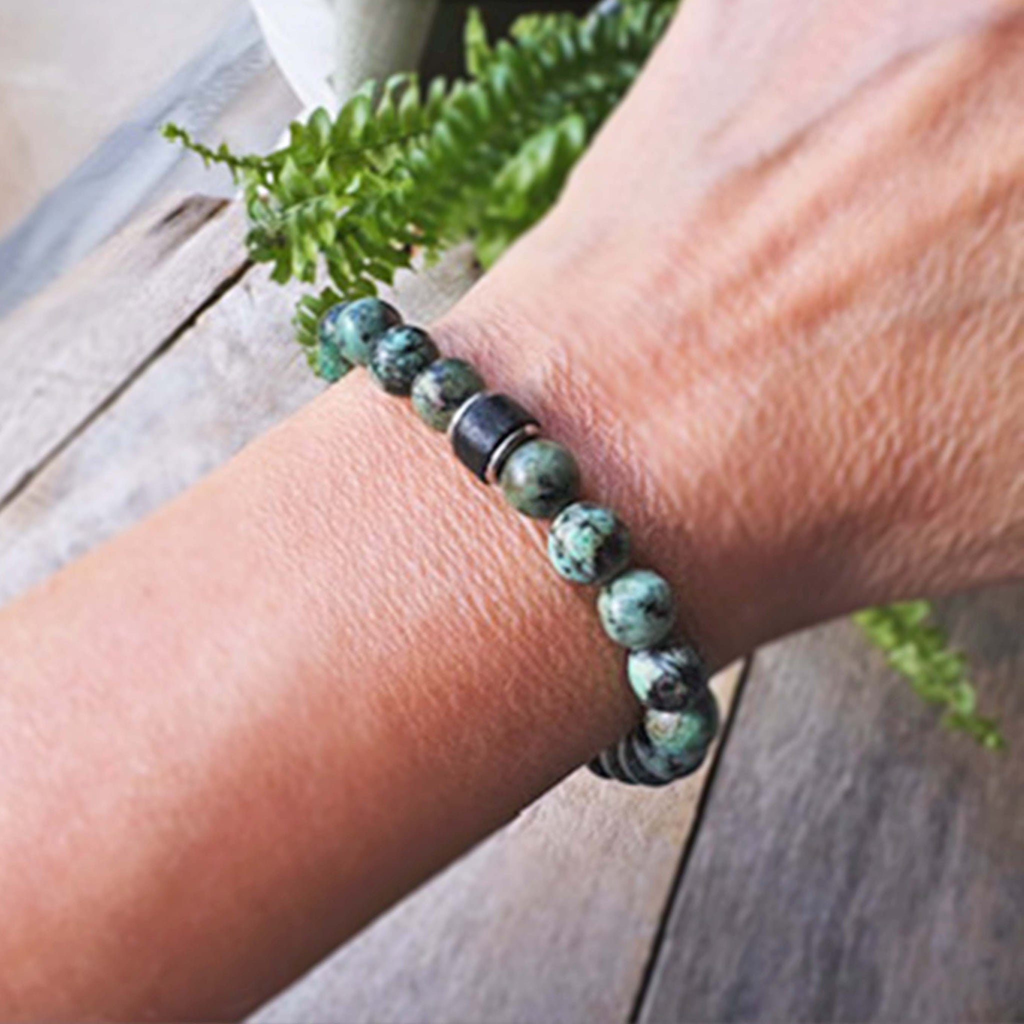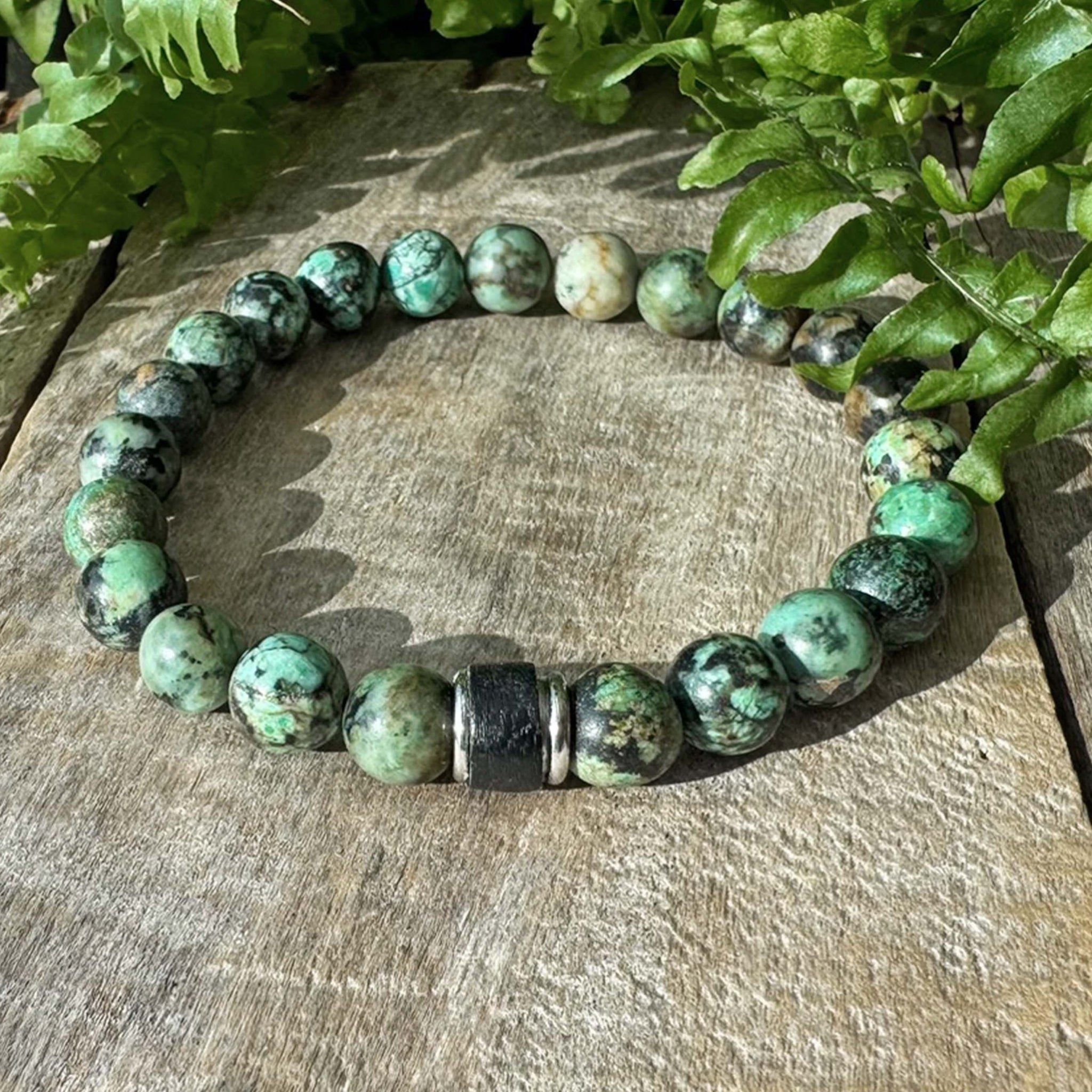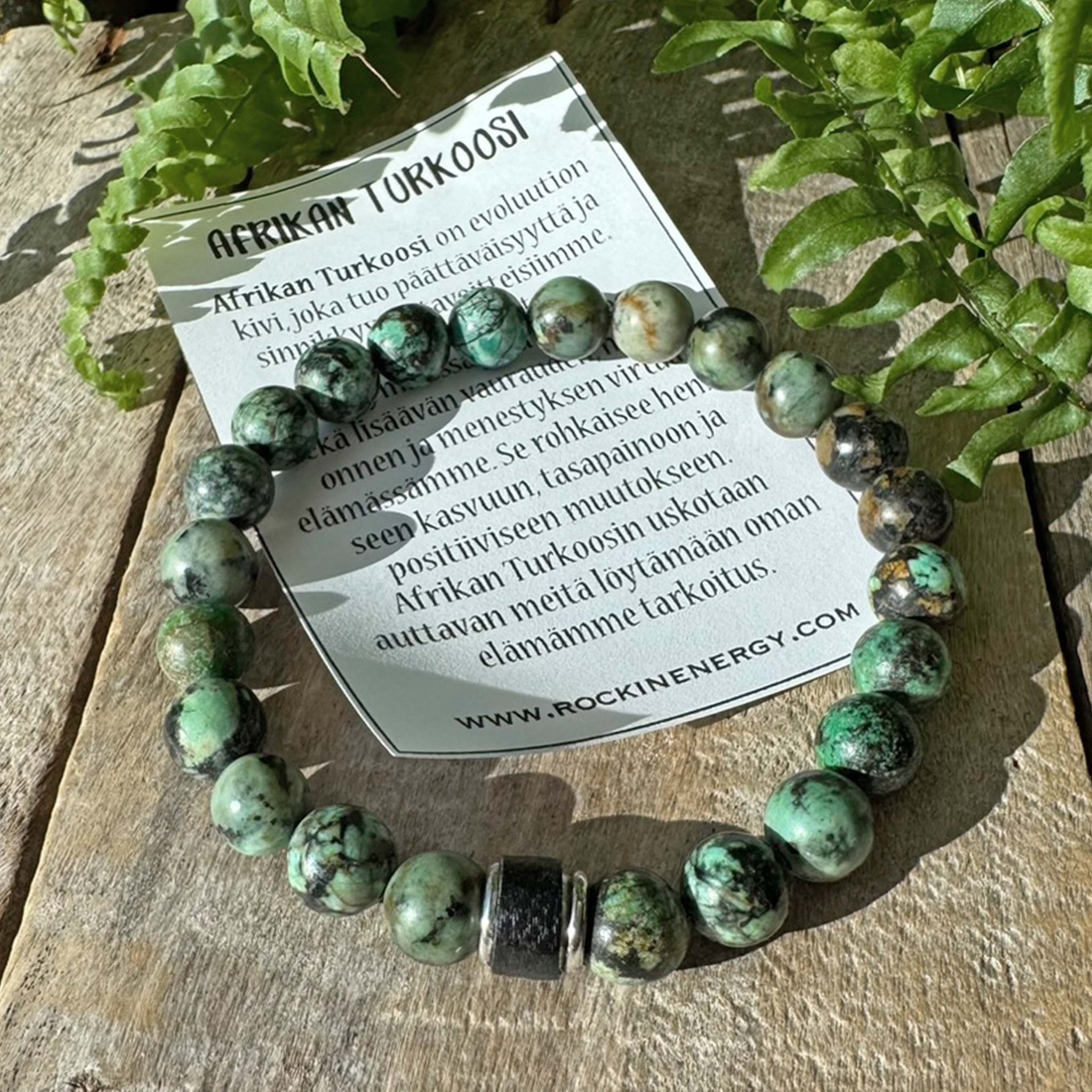 - Materiaalit: 8mm luonnon Afrikan Turkoosi helmiä, (kierrätetty)nahka/ kirurginteräs -helmi, elastinen siima.
