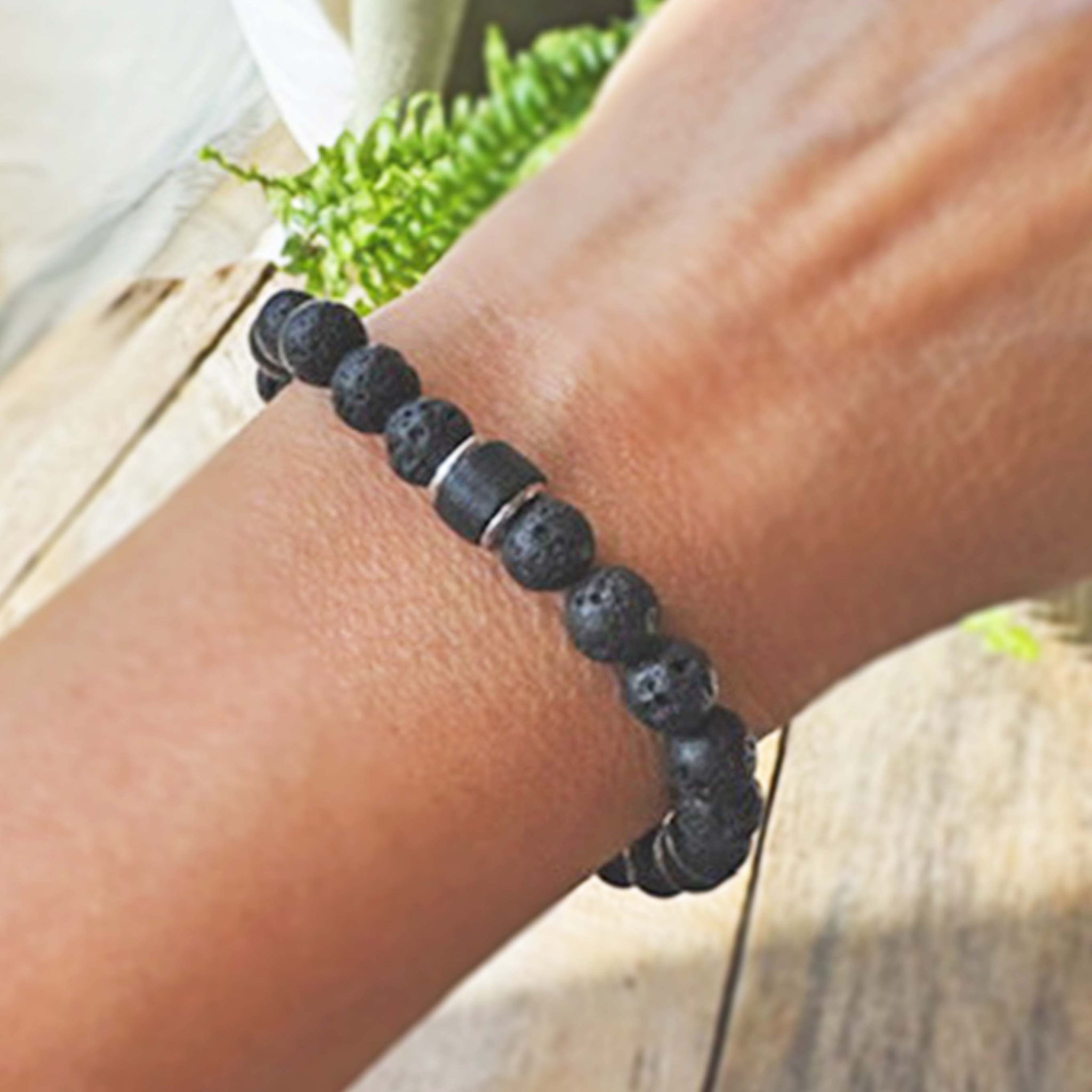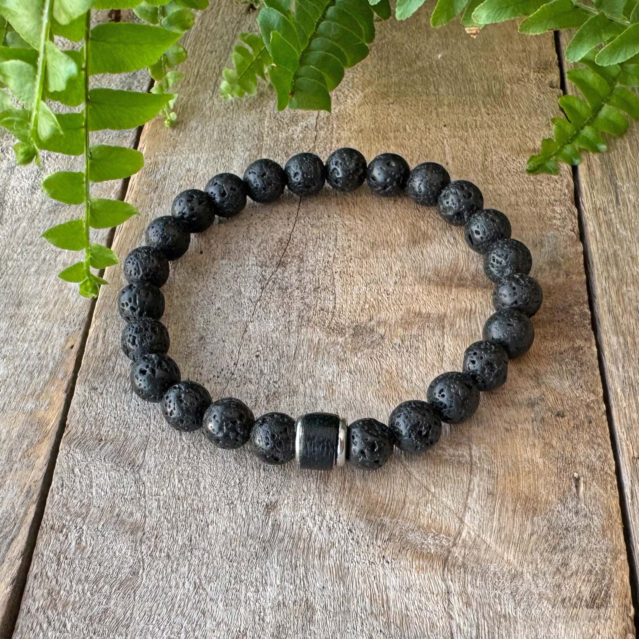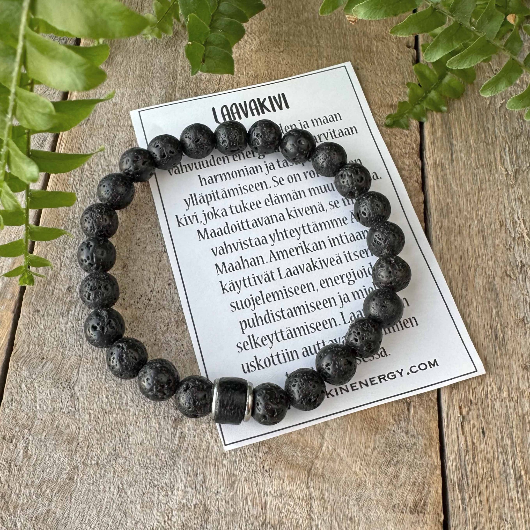 - Materiaalit: 8mm luonnon Laavakivihelmiä, (kierrätetty)nahka/ kirurginteräs -helmi, elastinen siima.
