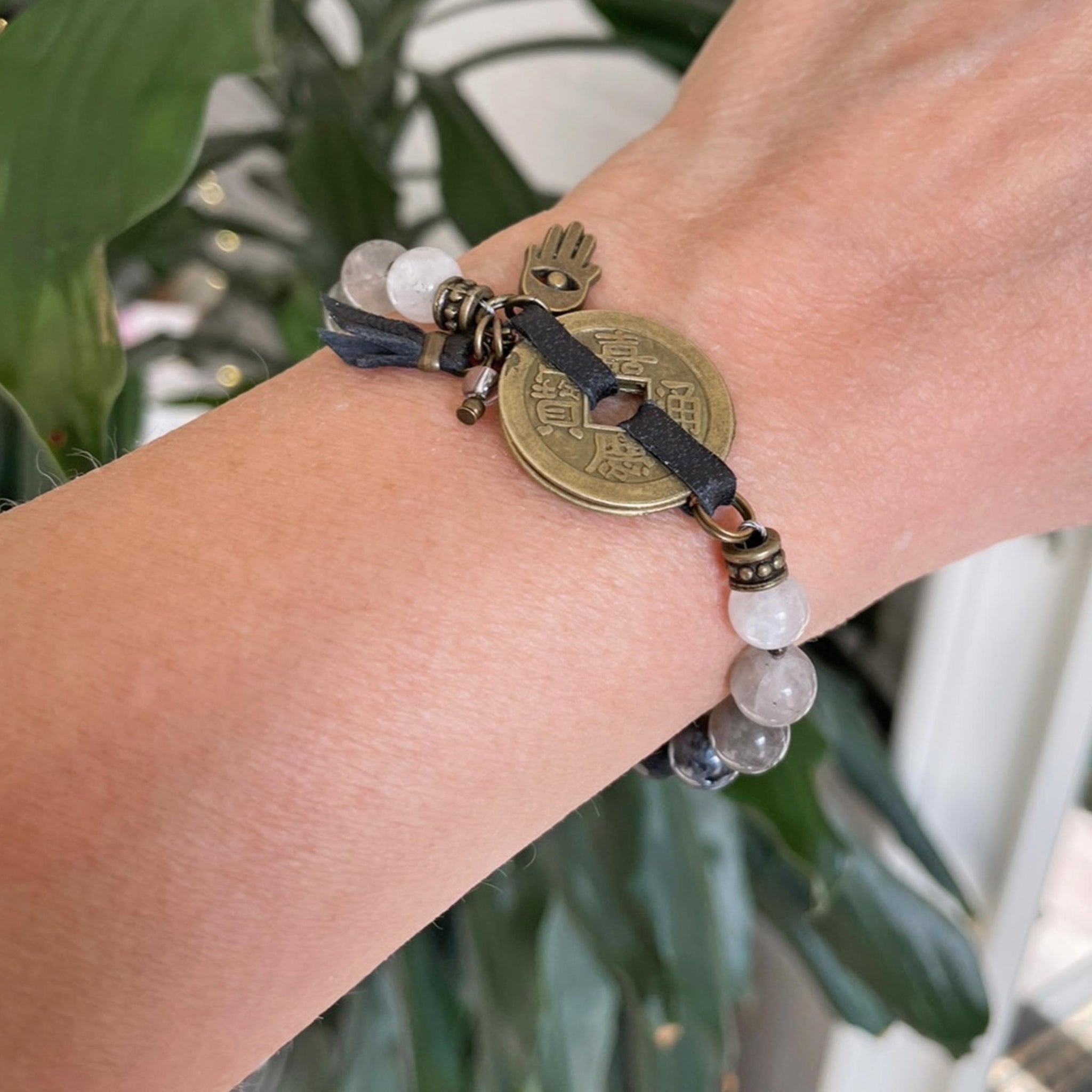Uusien alkujen energiaa kantava hyvän onnen kiinalainen kolikko rannekoru.