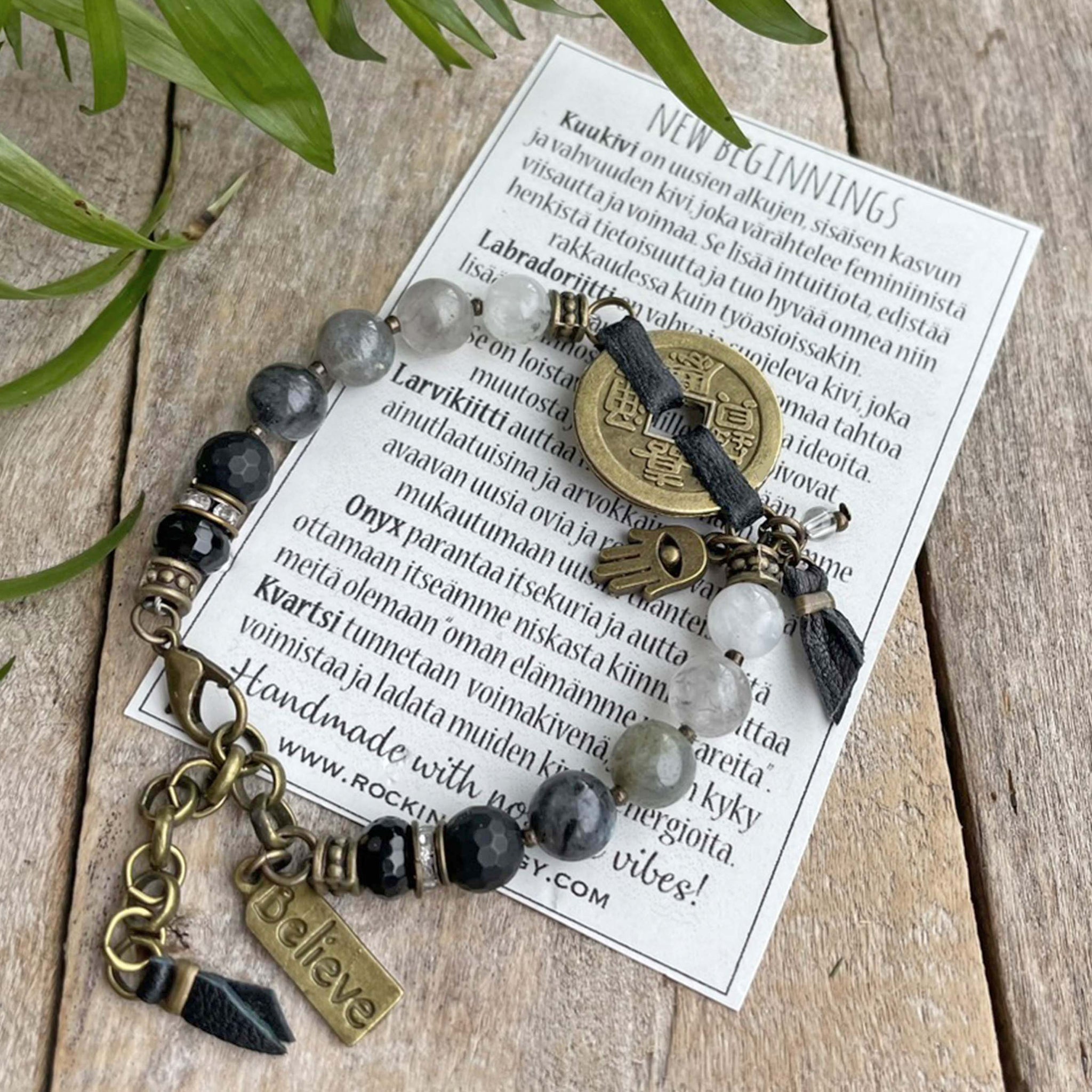 Kuukivi on uusien alkujen, sisäisen kasvun ja vahvuuden kivi, joka värähtelee feminiinistä viisautta ja voimaa. Se lisää intuitiota, edistää henkistä tietoisuutta ja tuo hyvää onnea  niin rakkaudessa kuin työasioissakin. Vuorikristalli voimistaa ja lataa energiaa ympärillään, myös muiden kivien energioita. Labradoriitti on vahva ja suojeleva kivi, joka lisää itseluottamusta, voimistaa omaa tahtoa sekä luo innostuneisuutta ja uusia ideoita. Se on hyvä kivi niille, jotka toivovat  muutosta ja seikkailuja elämään. Larvikiitti auttaa meitä näkemään itsemme ainutlaatuisina ja arvokkaina. Se avaa uusia ovia  ja rohkaisee mukautumaan uusiin tilanteisiin. Onyx on jalokivien Hercules, joka kasvattaa sisäistä voimaa ja vahvuutta, sekä parantaa itsekuria ja auttaa meitä ottamaan itseämme niskasta kiinni. Se auttaa meitä olemaan “oman elämämme mestareita”.