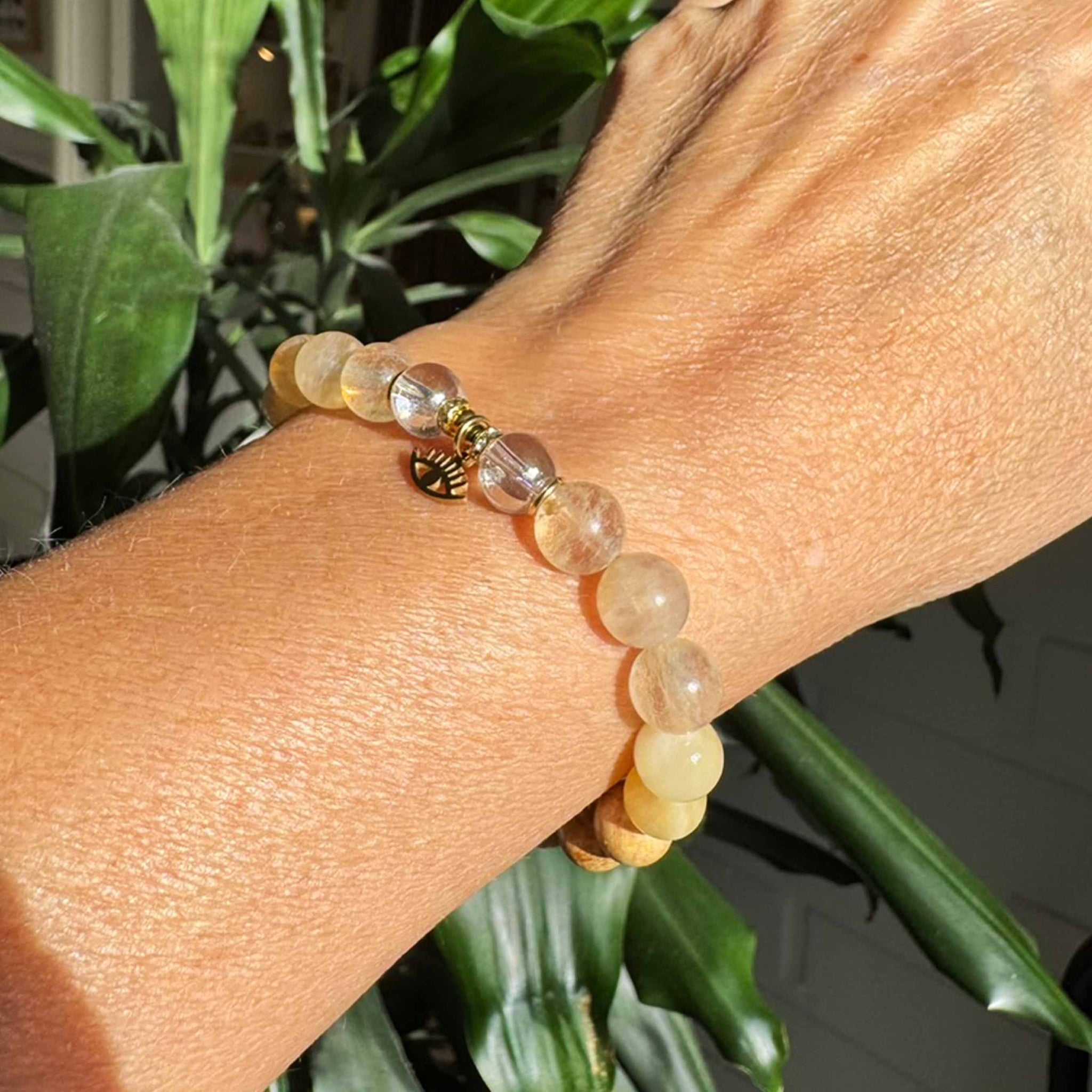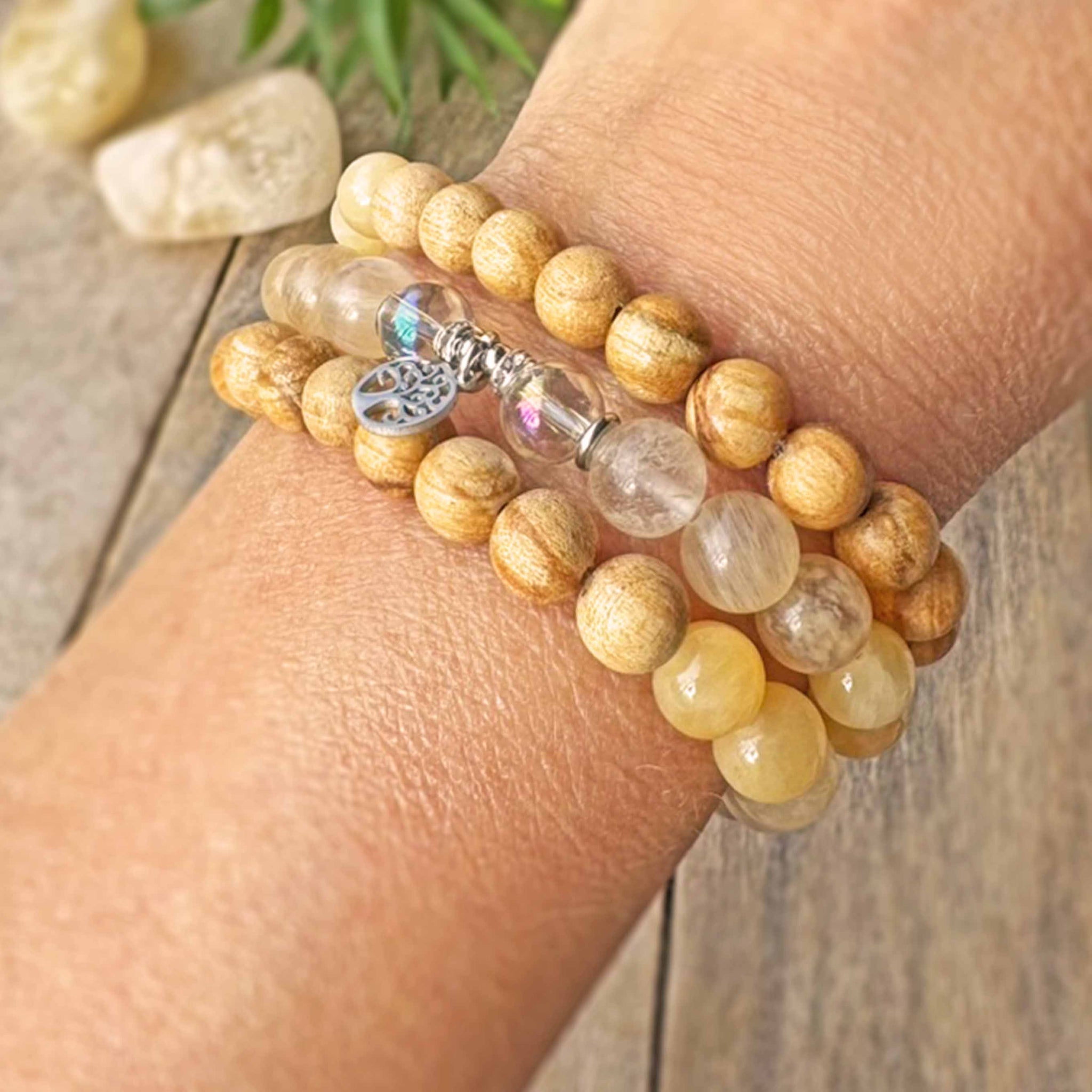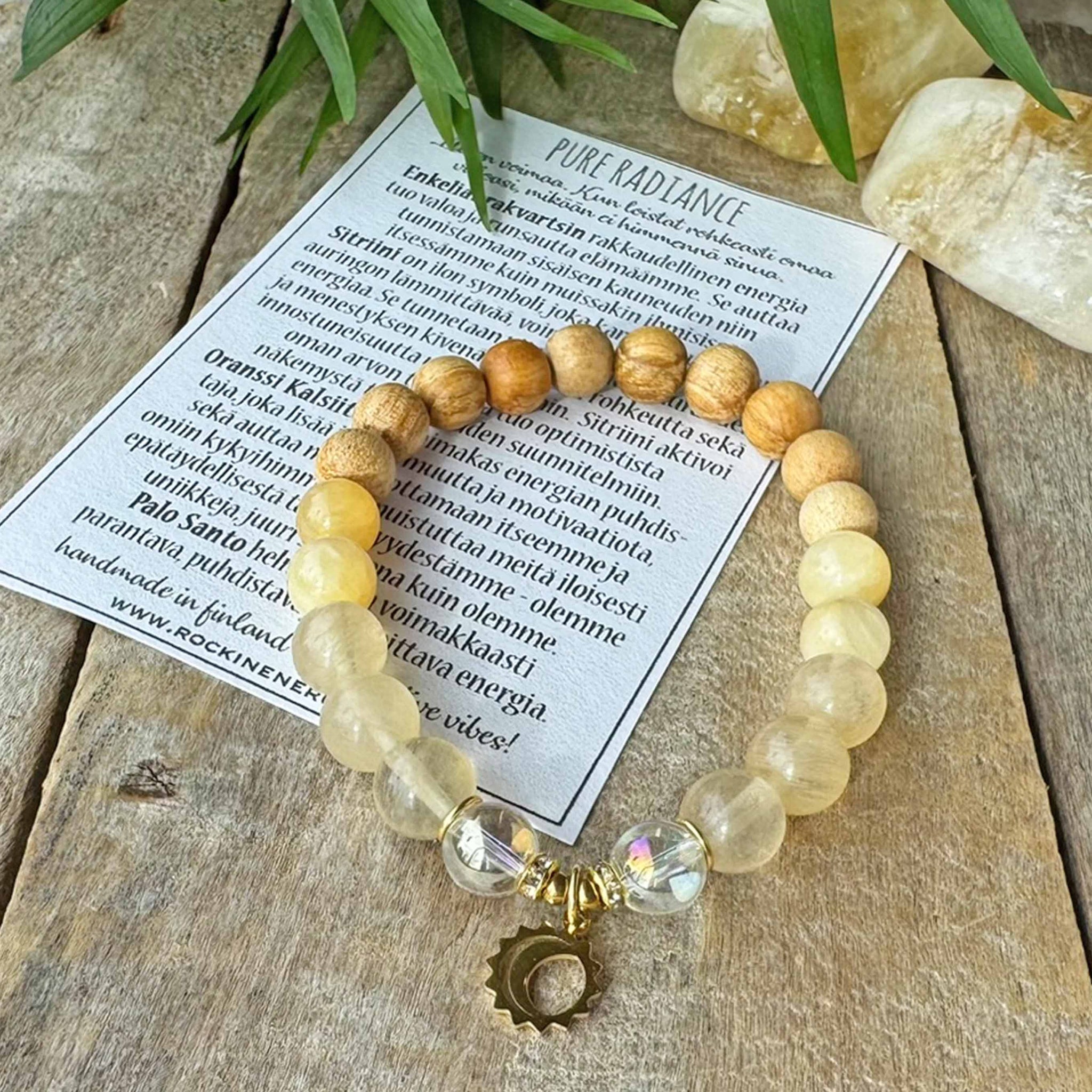 ➳ Enkeliaurakvartsin rakkaudellinen energia tuo valoa ja runsautta elämäämme. Se auttaa tunnistamaan sisäisen kauneuden niin itsessämme kuin muissakin ihmisissä. Sitriini on ilon symboli, joka kantaa mukanaan auringon lämmittävää, voimistavaa ja virkistävää energiaa. Se tunnetaan vitaalisuuden, vaurauden ja menestyksen kivenä, joka lisää rohkeutta sekä innostuneisuutta uusiin asioihin. Sitriini aktivoi oman arvon tuntoa ja tuo optimistista näkemystä tulevaisuuden suunnitelmiin. Oranssi Kalsiitti on voimakas energian puhdistaja, joka lisää itsevarmuutta ja motivaatiota, sekä auttaa meitä luottamaan itseemme ja omiin kykyihimme. Se muistuttaa meitä iloisesti epätäydellisestä täydellisyydestämme - olemme uniikkeja, juuri sellaisena kuin olemme. Palo Santo helmissä on voimakkaasti parantava, puhdistava ja rahoittava energia.
