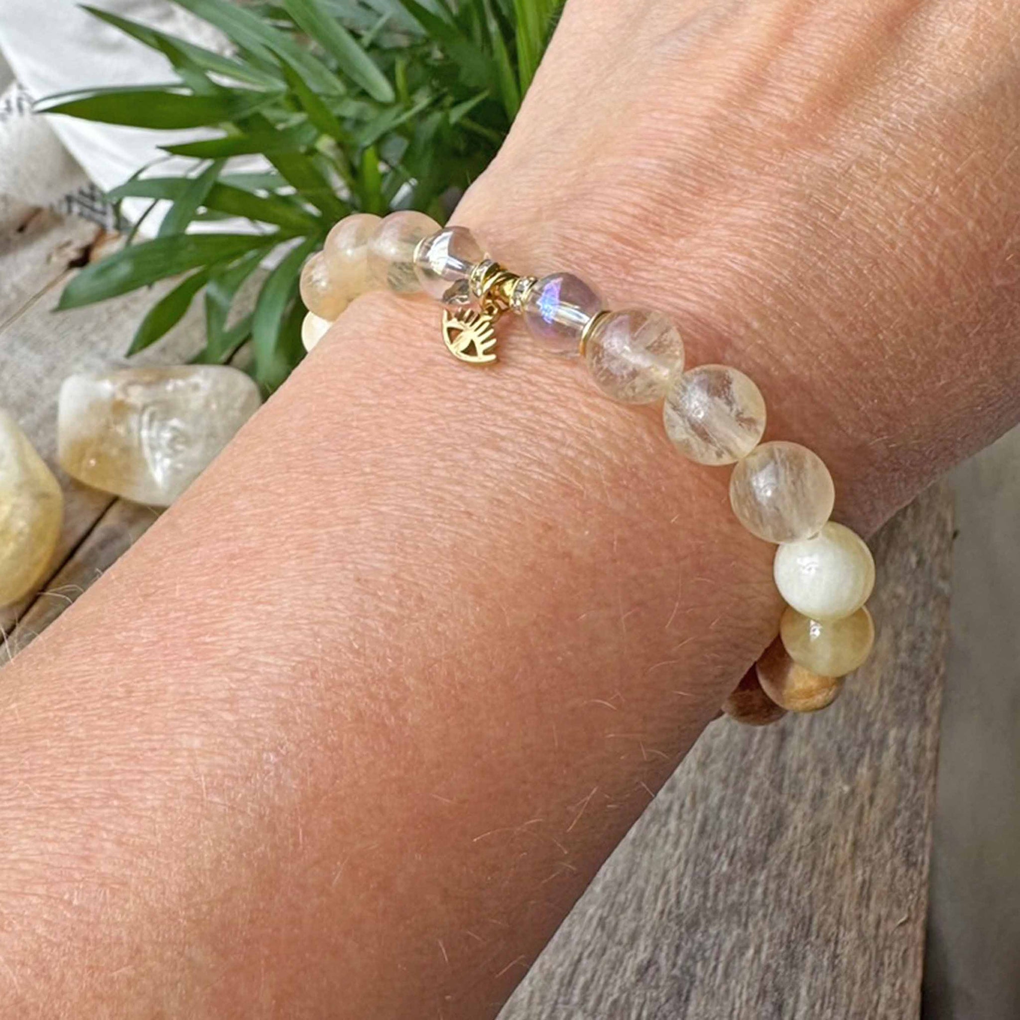 Kaunis, lämpimän keltainen "Pure Radiance" rannekoru laadukkaalla kirurginteräs (hopea/18k kullattu) charmilla.