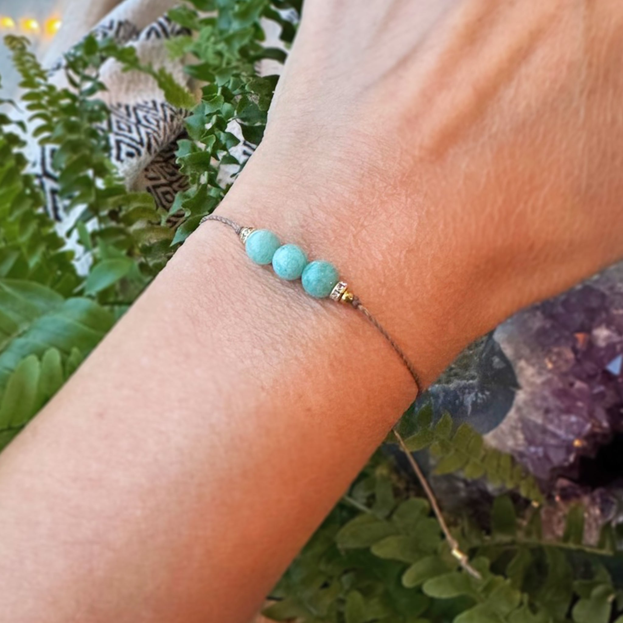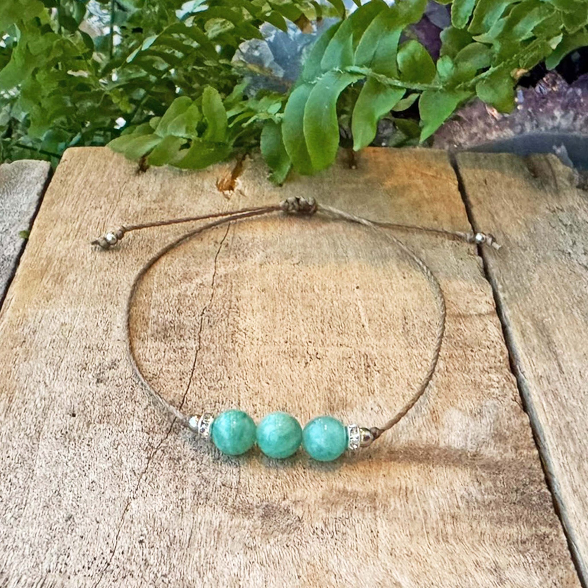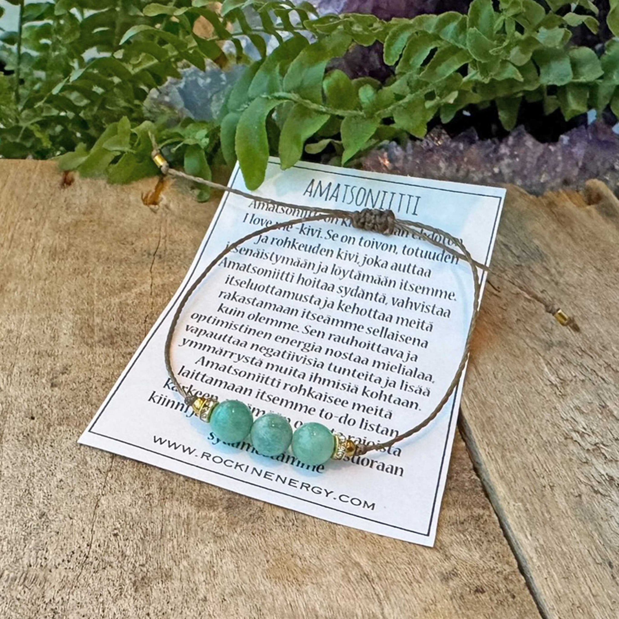 Kaunis minimalistinen, turkoosinvihreä Amatsoniitti nyörirannekoru pienillä bling -välihelmillä. Säädettävän koon ansiosta sopii jokaiseen ranteeseen. Ihana myös lapsille.