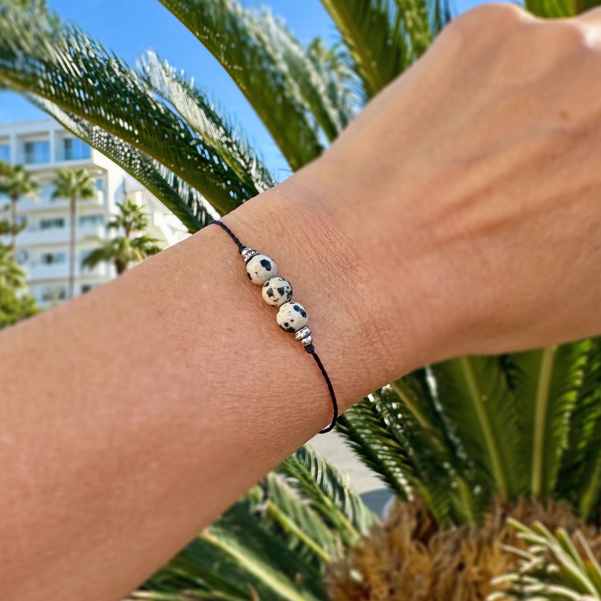 Minimalistinen täplikäs Dalmatian Jaspis nyörirannekoru pienillä bling -välihelmillä. Säädettävän koon ansiosta sopii jokaiseen ranteeseen. Ihana myös lapsille.