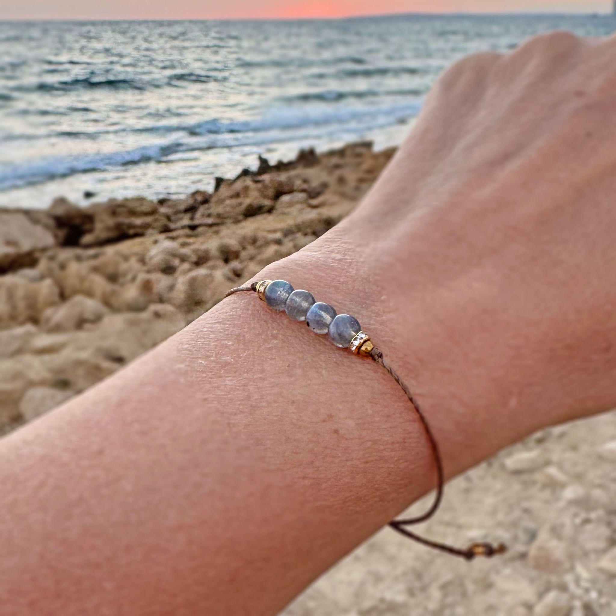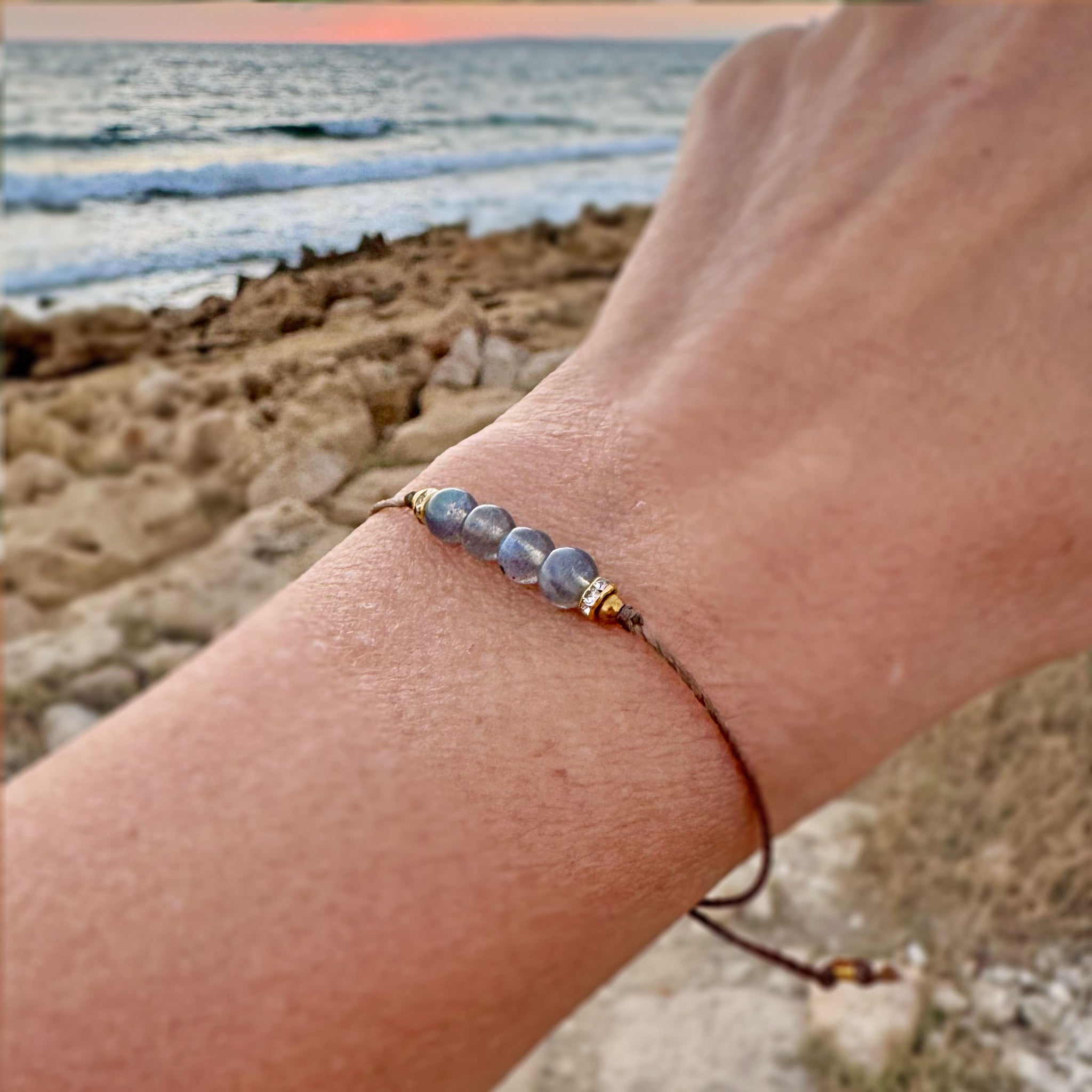 Minimalistinen kauniisti valoa taittava Labradoriitti nyörirannekoru pienillä bling -välihelmillä. Säädettävän koon ansiosta sopii jokaiseen ranteeseen. Ihana myös lapsille.