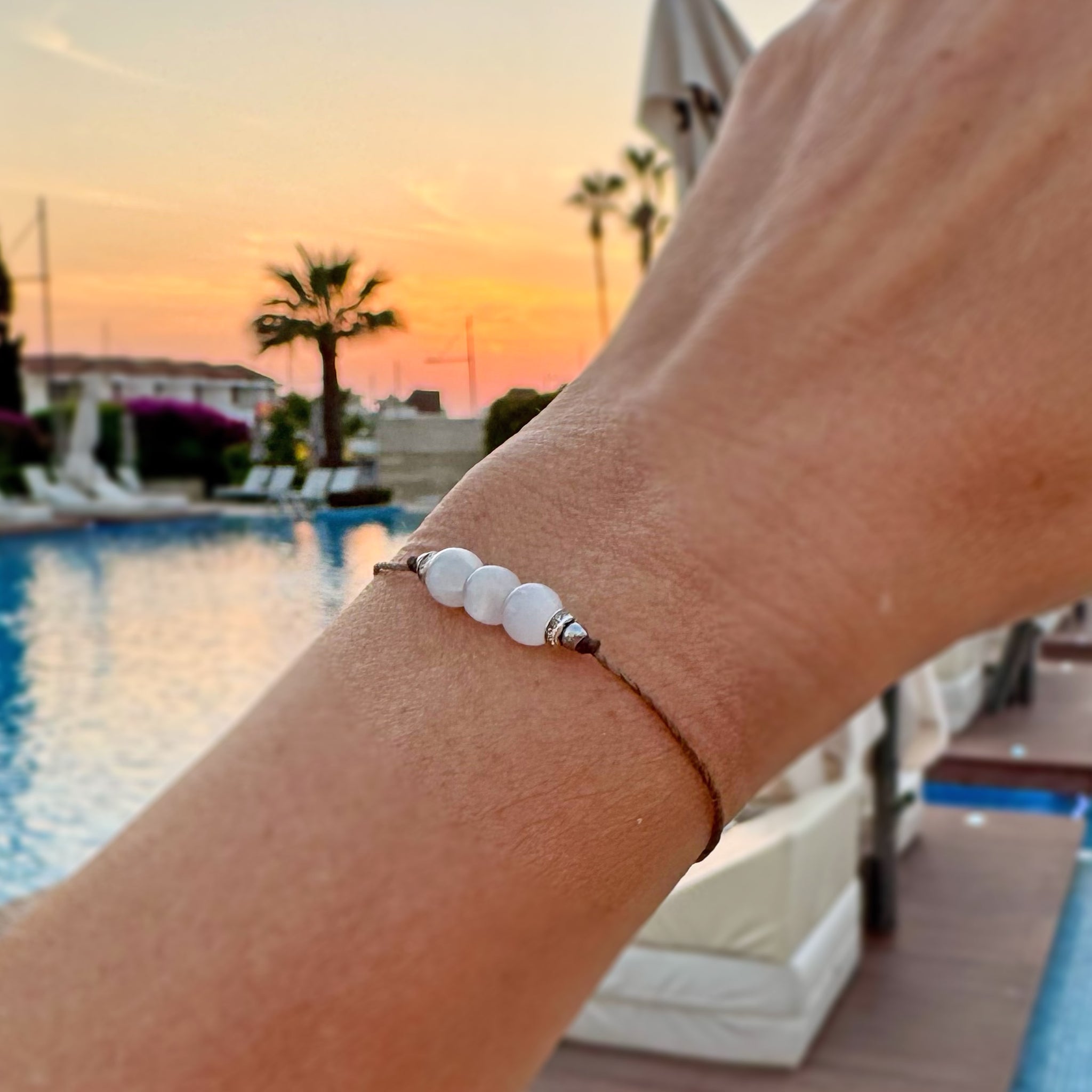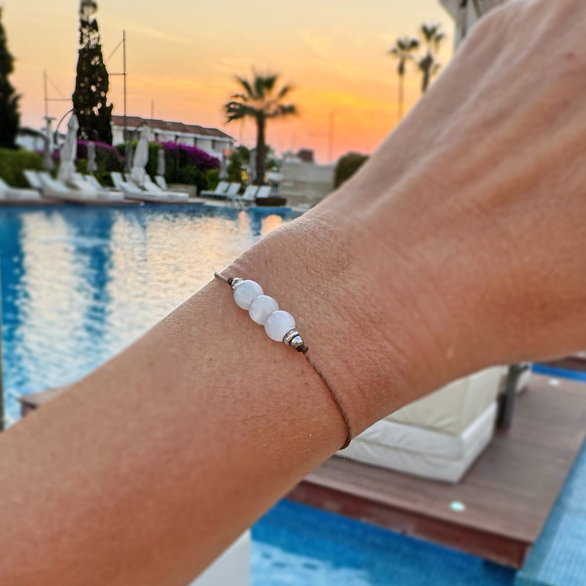 Kaunis minimalistinen valkoinen Seleniitti nyörirannekoru pienillä bling -välihelmillä. Säädettävän koon ansiosta sopii jokaiseen ranteeseen.