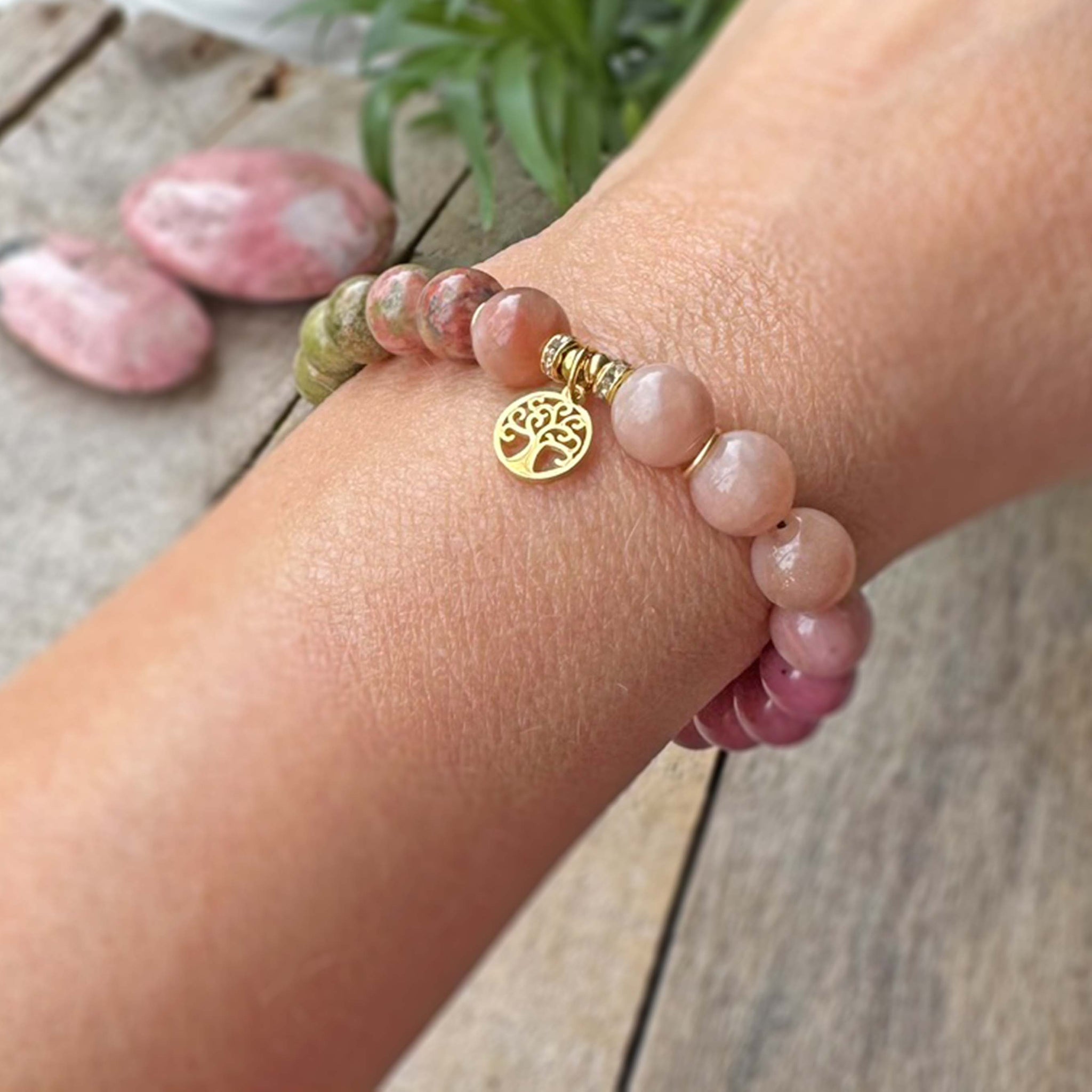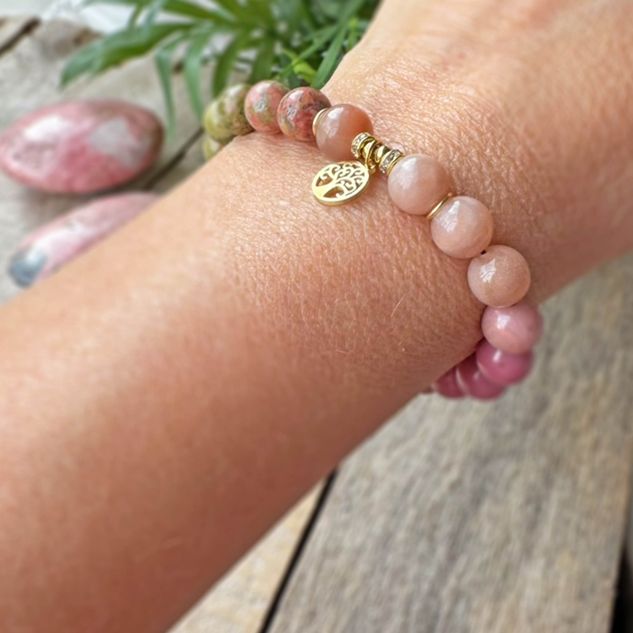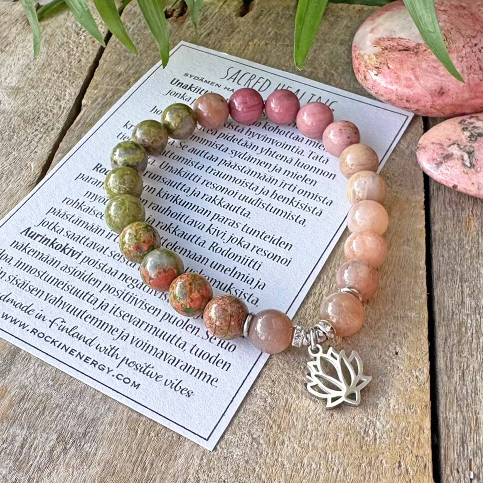 Unakiitti on voimakas ja harmonisoiva kivi, jonka pehmeä energia kohottaa mielialaa ja tukee henkistä hyvinvointia. Tätä hoivaavaa kiveä pidetään yhtenä luonnon  parantavimmista sydämen ja mielen kristalleista. Se auttaa päästämään irti omista tiedostamattomista traumoista ja henkisistä haavoista. Unakiitti resonoi uudistumista,  runsautta ja rakkautta. Rodoniitti on kivikunnan paras tunteiden parantaja. Se on rauhoittava kivi, joka resonoi myötätuntoa ja rakkautta. Rodoniitti rohkaisee myös tavoittelemaan unelmia ja päästämään irti rajoittavista uskomuksista, jotka saattavat seistä tavotteidemme tiellä. Aurinkokivi poistaa negatiivisuutta ja auttaa näkemään asioiden positiivisen puolen. Se luo iloa, innostuneisuutta ja itsevarmuutta, tuoden esiin sisäisen vahvuutemme ja voimavaramme.