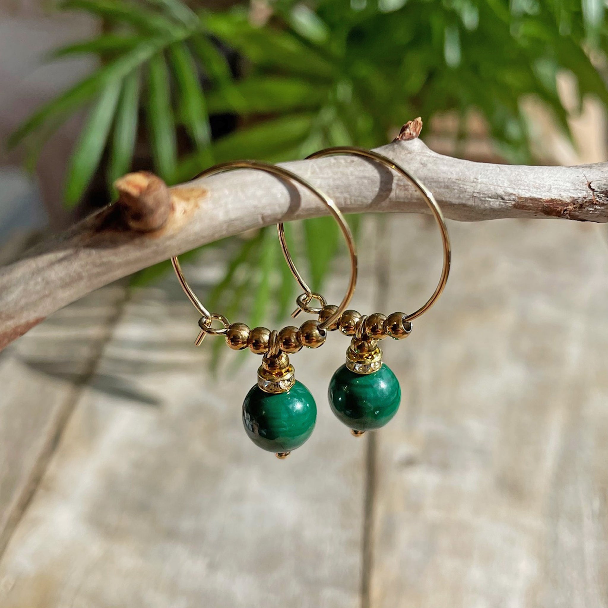 - Materiaalit: 8 tai 10mm Malakiittihelmiä, metalliosat allergiavapaata ruostumatonta kirurginterästä, välkehtiviä rhinestone -välihelmiä. Koukuissa on mukana silikonistopparit.