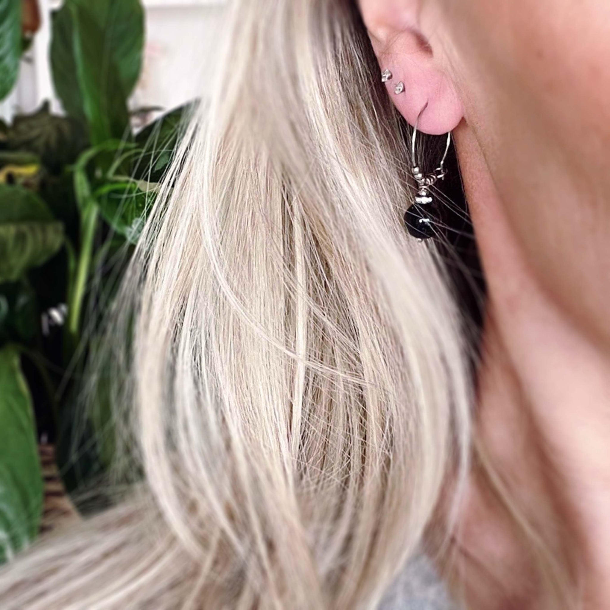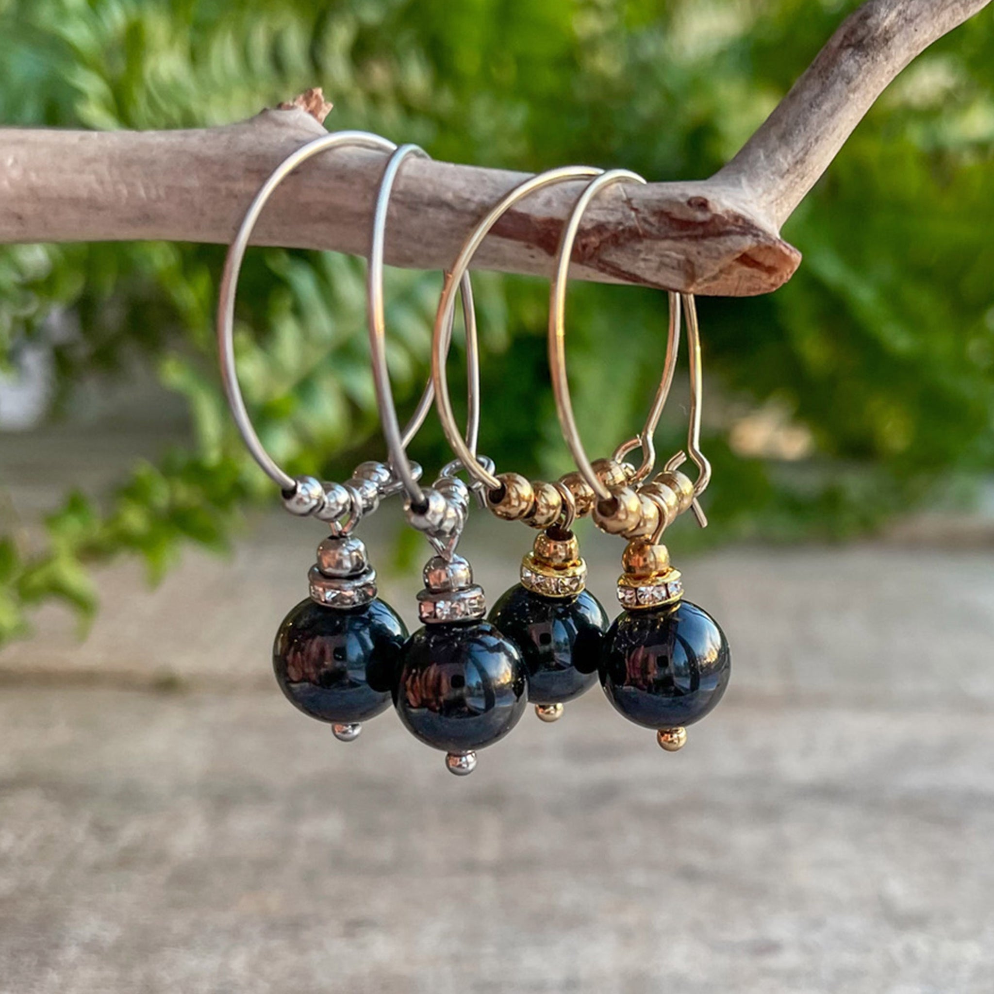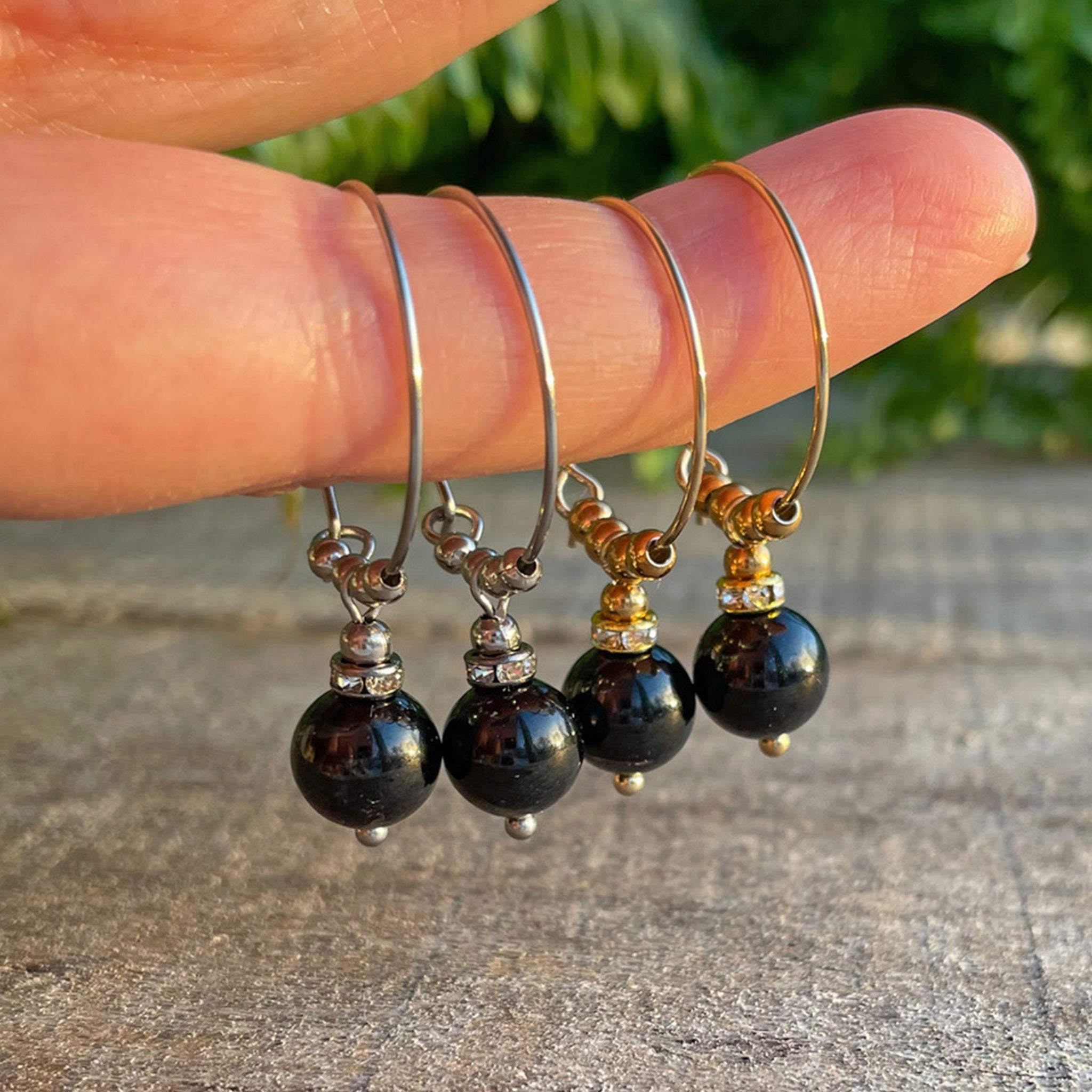 - Materiaalit: 8mm pyöreä Musta Turmaliini -helmi, metalliosat allergiavapaata ruostumatonta kirurginterästä/ 18k kullattua kirurginterästä, välkehtiviä rhinestone -välihelmiä. Koukuissa on mukana silikonistopparit.