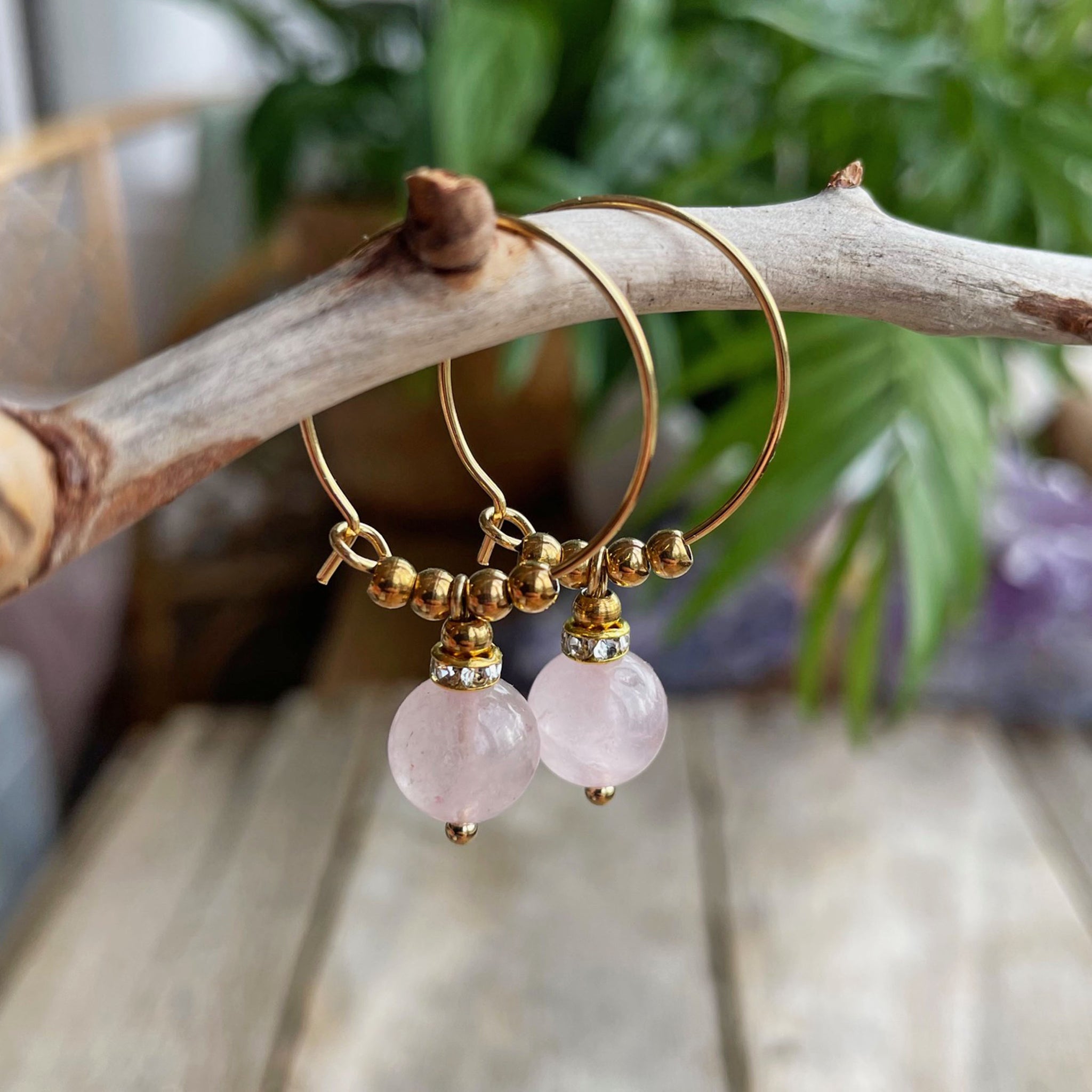 - Materiaalit: 8mm tai 10mm Ruusukvartsi -helmet, koukut ja renkaat allergiavapaata kirurginterästä - hopea tai 18k kullattu, välkehtiviä rhinestone -välihelmiä. Koukuissa on mukana silikonistopparit.