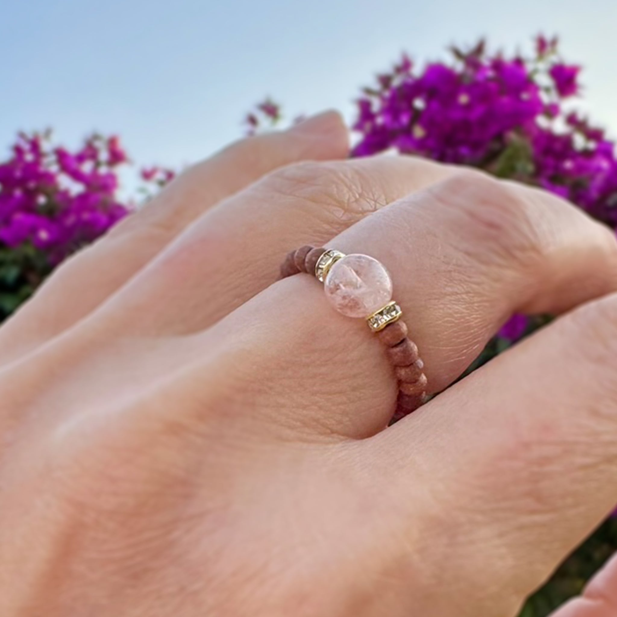 Uniikki säädettävä Morganiitti sormus söpöillä pienillä Santelipuun helmillä. Itse kuvailen Morganiitin energiaa: "Vähän kuin Ruusukvartsi ja Sitriini olisi saanut lapsen" :)