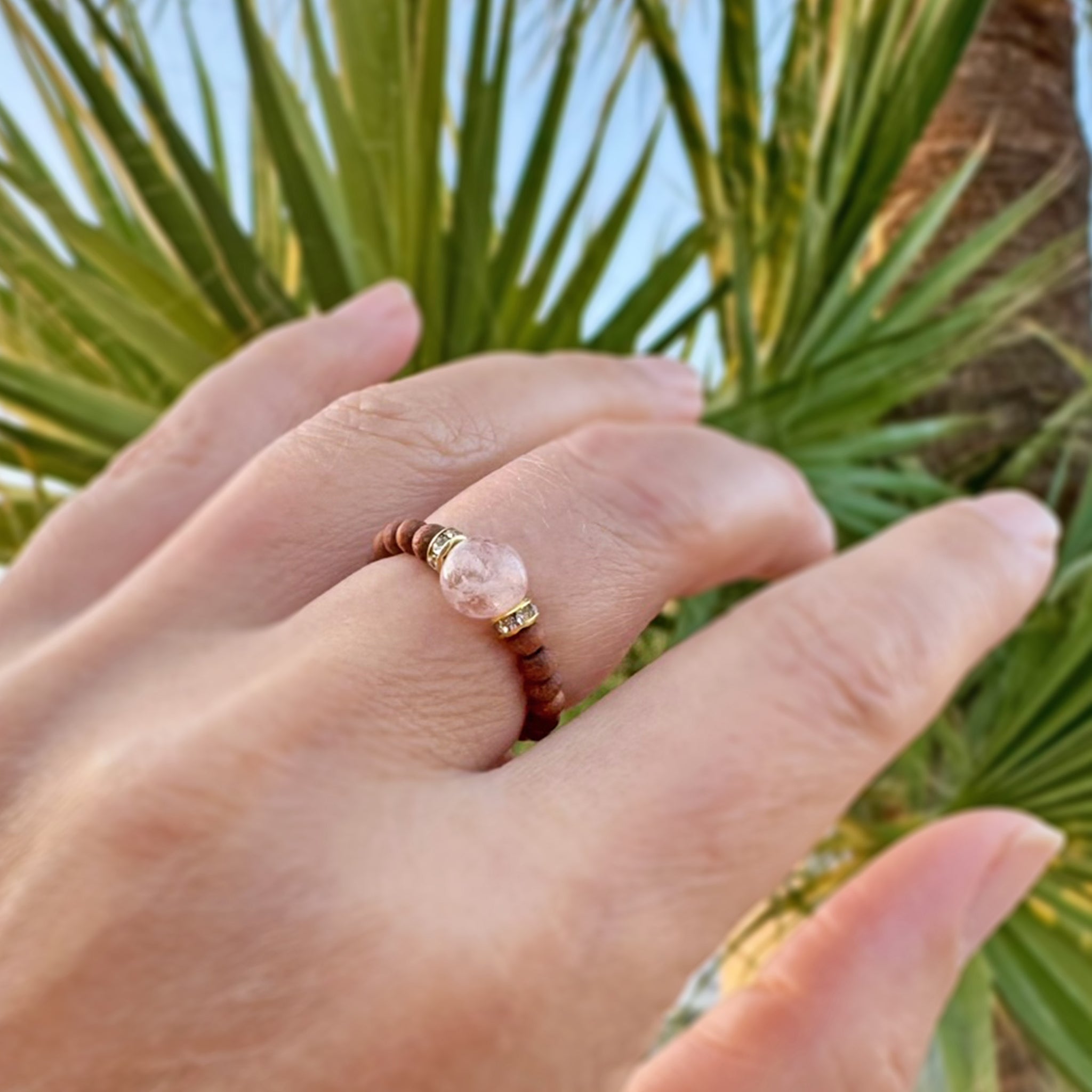- Materiaalit: 3-4mm Santelipuun helmiä, freeform Morganiitti, välkehtiviä rhinestone -välihelmiä. Sormus on tehty vahvaan memory wire - teräslankaan, joka säilyttää alkuperäisen muotonsa.